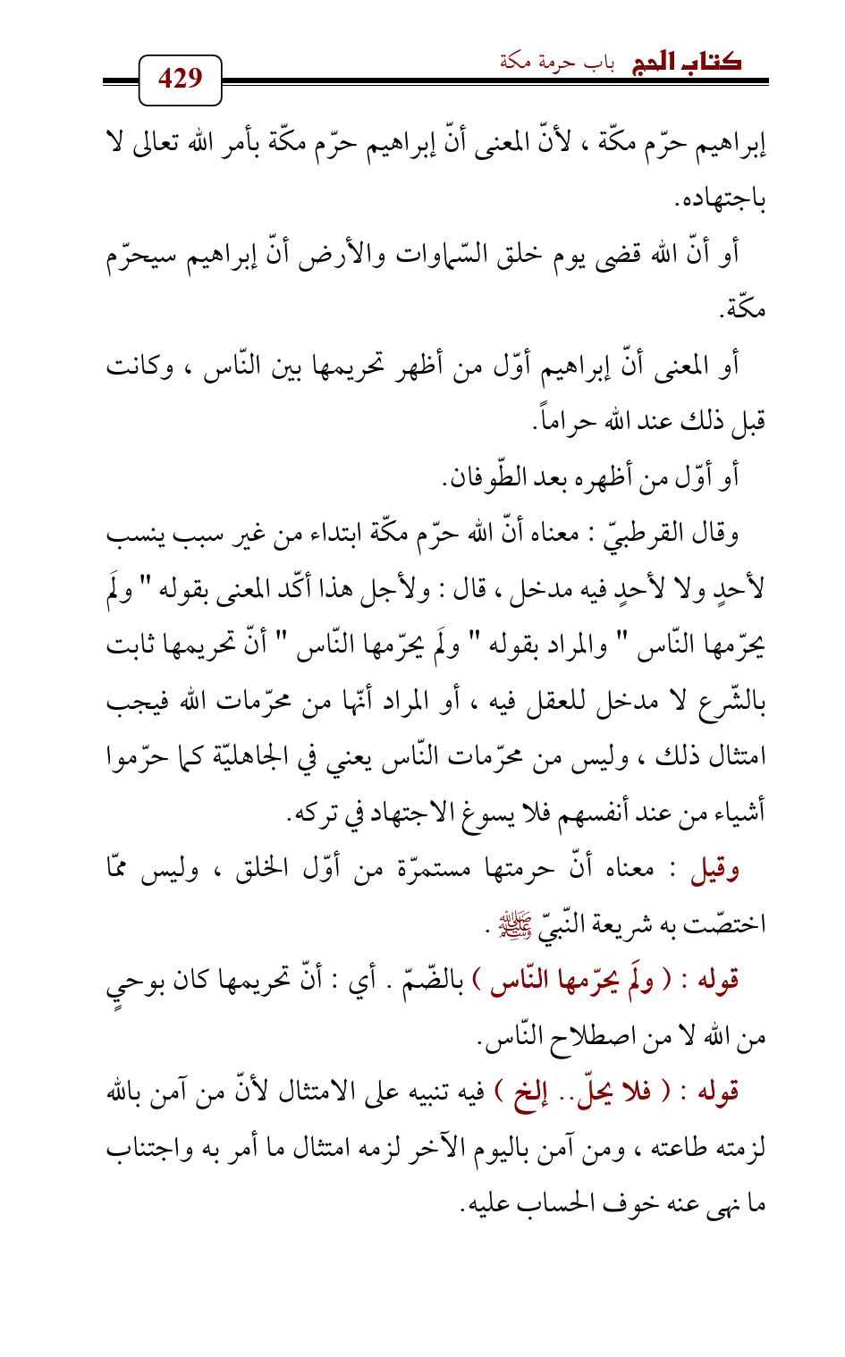 وقال القرطبيّ: معناه أنّ الله حرّم مكّة ابتداء من غير سبب ينسب لأحدٍ ولا لأحدٍ فيه مدخل , قال: ولأجل هذا أكّد المعنى بقوله " ولَم يحرّمها النّاس " والمراد بقوله " ولَم يحرّمها النّاس " أنّ تحريمها ثابت بالشّرع لا مدخل للعقل فيه، أو المراد أنّها من محرّمات الله فيجب امتثال ذلك، وليس من محرّمات النّاس يعني في الجاهليّة كما حرّموا أشياء من عند أنفسهم فلا يسوغ الاجتهاد في تركه.