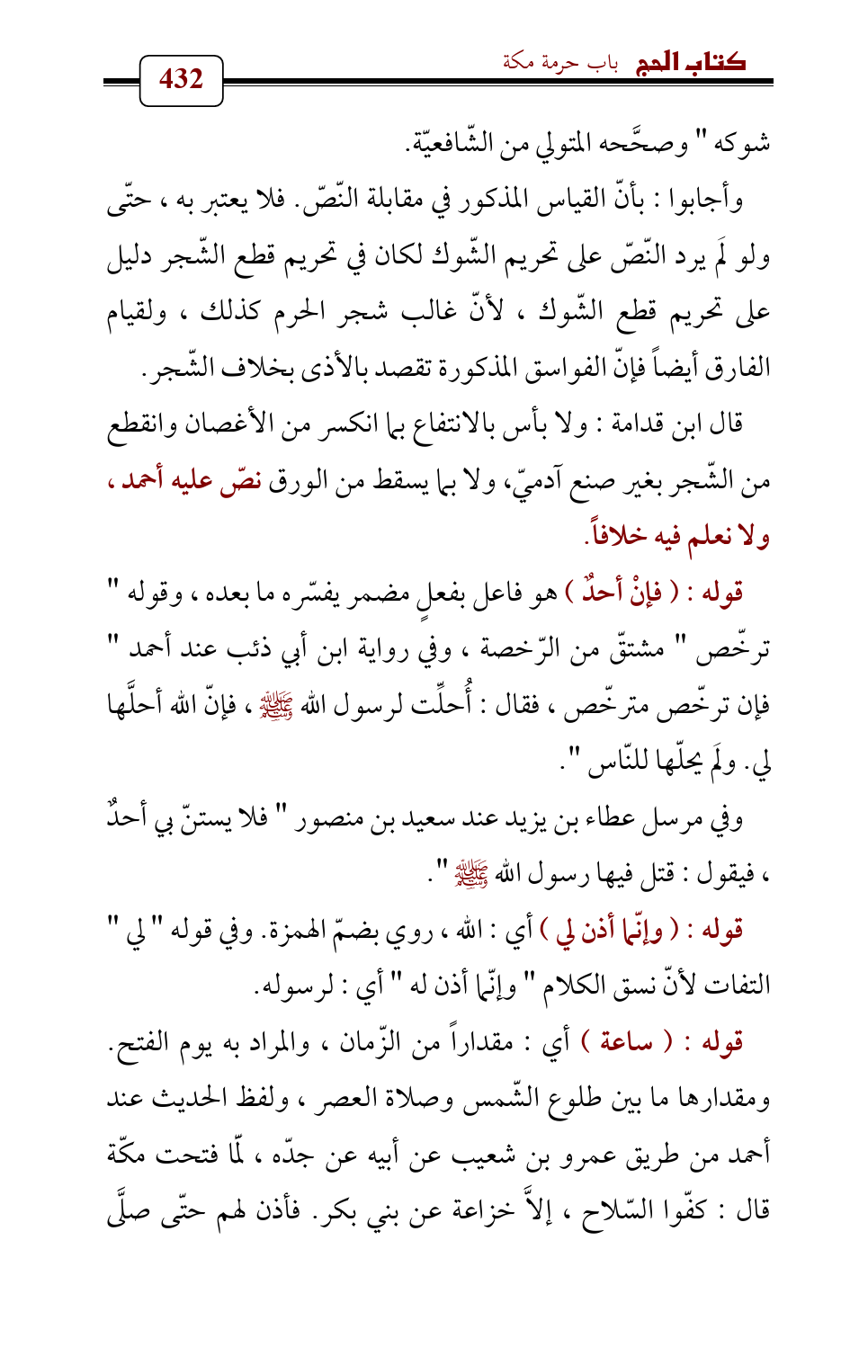 وأجابوا: بأنّ القياس المذكور في مقابلة النّصّ. فلا يعتبر به، حتّى ولو لَم يرد النّصّ على تحريم الشّوك لكان في تحريم قطع الشّجر دليل على تحريم قطع الشّوك , لأنّ غالب شجر الحرم كذلك، ولقيام الفارق أيضاً فإنّ الفواسق المذكورة تقصد بالأذى بخلاف الشّجر.