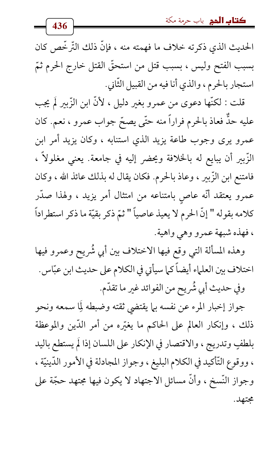 قلت: لكنّها دعوى من عمرو بغير دليل، لأنّ ابن الزّبير لَم يجب عليه حدٌّ فعاذ بالحرم فراراً منه حتّى يصحّ جواب عمرو، نعم. كان عمرو يرى وجوب طاعة يزيد الذي استنابه، وكان يزيد أمر ابن الزّبير أن يبايع له بالخلافة ويحضر إليه في جامعة. يعني مغلولاً , فامتنع ابن الزّبير , وعاذ بالحرم. فكان يقال له بذلك عائذ الله، وكان عمرو يعتقد أنّه عاصٍ بامتناعه من امتثال أمر يزيد , ولهذا صدّر كلامه بقوله " إنّ الحرم لا يعيذ عاصياً " ثمّ ذكر بقيّة ما ذكر استطراداً، فهذه شبهة عمرو وهي واهية.