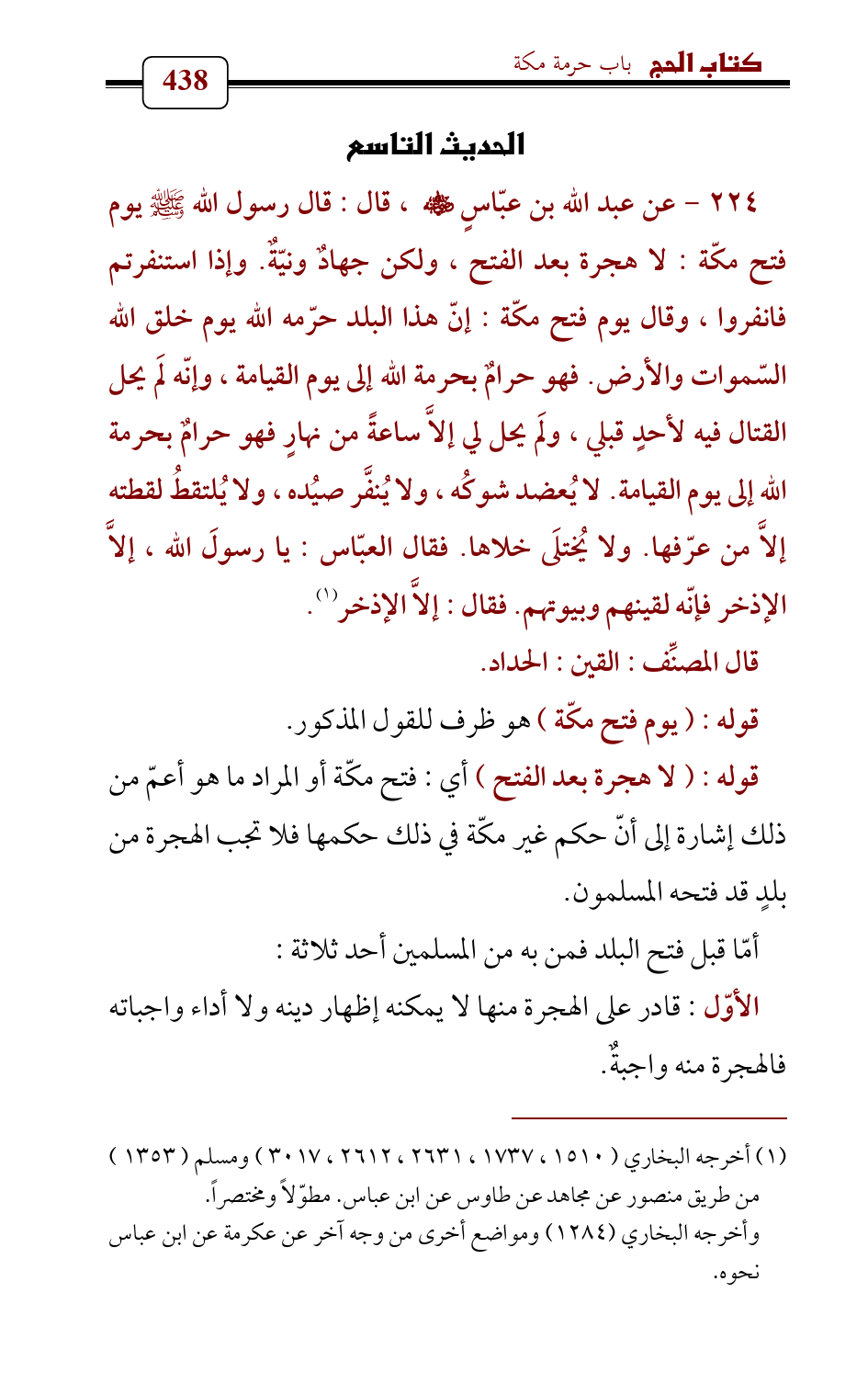 224 - عن عبد الله بن عبّاسٍ - رضي الله عنه - , قال: قال رسول الله - صلى الله عليه وسلم - يوم فتح مكّة: لا هجرة بعد الفتح , ولكن جهادٌ ونيّةٌ. وإذا استنفرتم فانفروا , وقال يوم فتح مكّة: إنّ هذا البلد حرّمه الله يوم خلق الله السّموات والأرض. فهو حرامٌ بحرمة الله إلى يوم القيامة , وإنّه لَم يحل القتال فيه لأحدٍ قبلي , ولَم يحل لي إلاَّ ساعةً من نهارٍ فهو حرامٌ بحرمة الله إلى يوم القيامة. لا يُعضد شوكُه , ولا يُنفَّر صيُده , ولا يُلتقطُ لقطته إلاَّ من عرّفها. ولا يُختلَى خلاها. فقال العبّاس: يا رسولَ الله , إلاَّ الإذخر فإنّه لقينهم وبيوتهم. فقال: إلاَّ الإذخر (¬1).