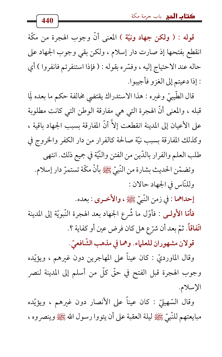 قوله: (ولكن جهاد ونيّة) المعنى أنّ وجوب الهجرة من مكّة انقطع بفتحها إذ صارت دار إسلام، ولكن بقي وجوب الجهاد على حاله عند الاحتياج إليه، وفسّره بقوله: (فإذا استنفرتم فانفروا) أي: إذا دعيتم إلى الغزو فأجيبوا.