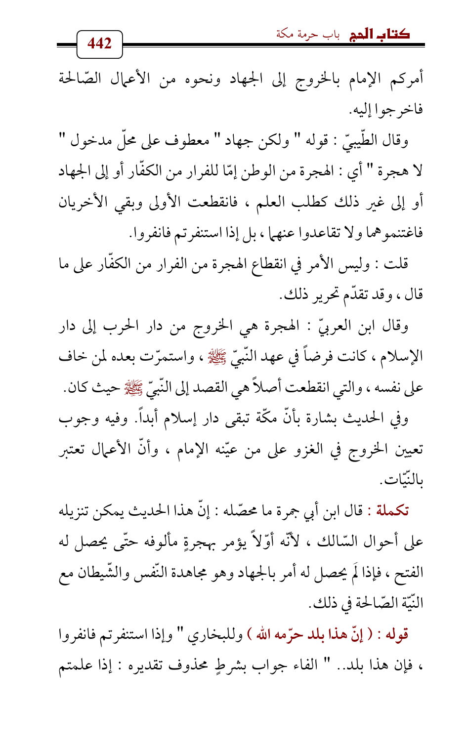 وقال الطّيبيّ: قوله " ولكن جهاد " معطوف على محلّ مدخول " لا هجرة " أي: الهجرة من الوطن إمّا للفرار من الكفّار أو إلى الجهاد أو إلى غير ذلك كطلب العلم، فانقطعت الأولى وبقي الأخريان فاغتنموهما ولا تقاعدوا عنهما، بل إذا استنفرتم فانفروا.