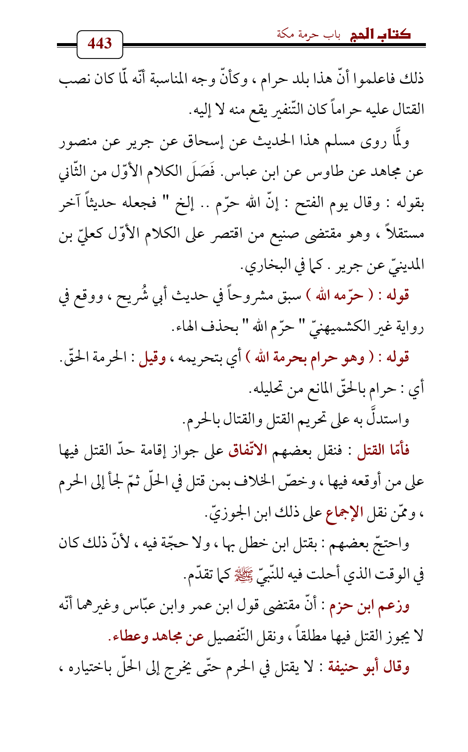 قوله: (حرّمه الله) سبق مشروحاً في حديث أبي شُريح، ووقع في رواية غير الكشميهنيّ " حرّم الله " بحذف الهاء.