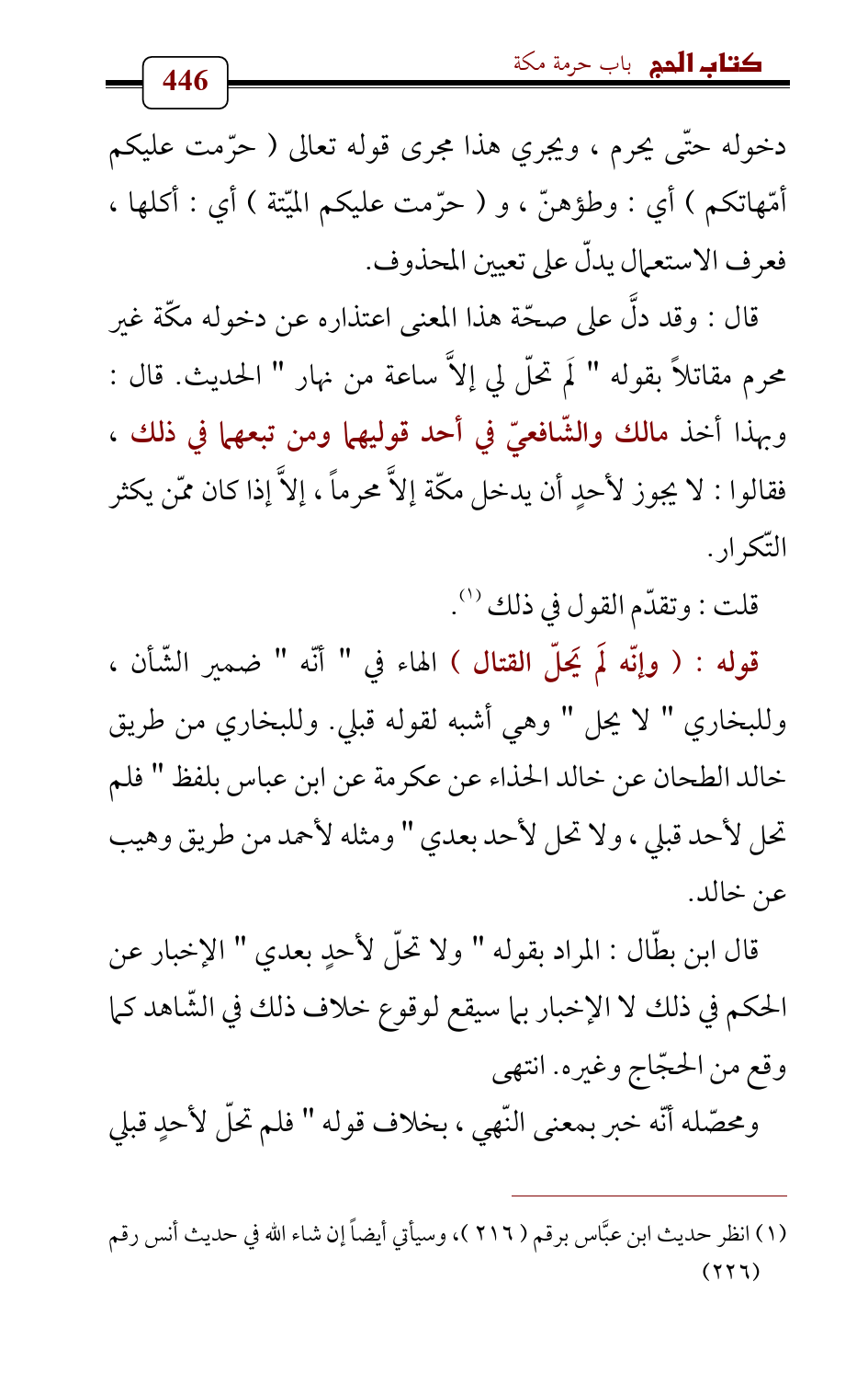 قال: وقد دلَّ على صحّة هذا المعنى اعتذاره عن دخوله مكّة غير محرم مقاتلاً بقوله " لَم تحلّ لي إلاَّ ساعة من نهار " الحديث. قال: وبهذا أخذ مالك والشّافعيّ في أحد قوليهما ومن تبعهما في ذلك , فقالوا: لا يجوز لأحدٍ أن يدخل مكّة إلاَّ محرماً، إلاَّ إذا كان ممّن يكثر التّكرار.