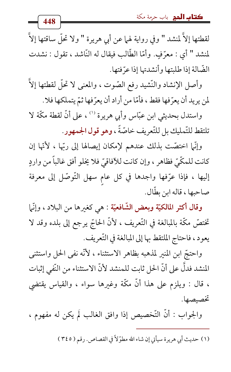 واحتجّ ابن المنير لمذهبه بظاهر الاستثناء، لأنّه نفى الحل واستثنى المنشد فدلَّ على أنّ الحل ثابت للمنشد لأنّ الاستثناء من النّفي إثبات، قال: ويلزم على هذا أنّ مكّة وغيرها سواء، والقياس يقتضي تخصيصها.