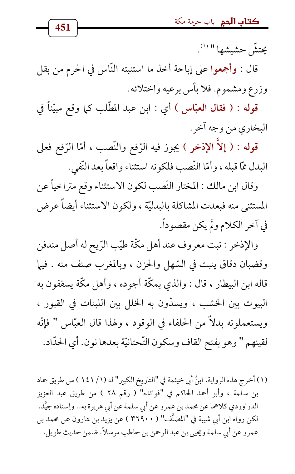 قوله: (إلاَّ الإذخر) يجوز فيه الرّفع والنّصب، أمّا الرّفع فعلى البدل ممّا قبله، وأمّا النّصب فلكونه استثناء واقعاً بعد النّفي.