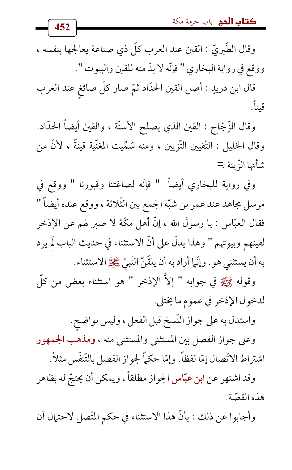وفي رواية للبخاري أيضاً " فإنّه لصاغتنا وقبورنا " ووقع في مرسل مجاهد عند عمر بن شبّة الجمع بين الثّلاثة، ووقع عنده أيضاً " فقال العبّاس: يا رسولَ الله، إنّ أهل مكّة لا صبر لهم عن الإذخر لقينهم وبيوتهم " وهذا يدلّ على أنّ الاستثناء في حديث الباب لَم يرد به أن يستثني هو. وإنّما أراد به أن يلقّنّ النّبيّ - صلى الله عليه وسلم - الاستثناء.