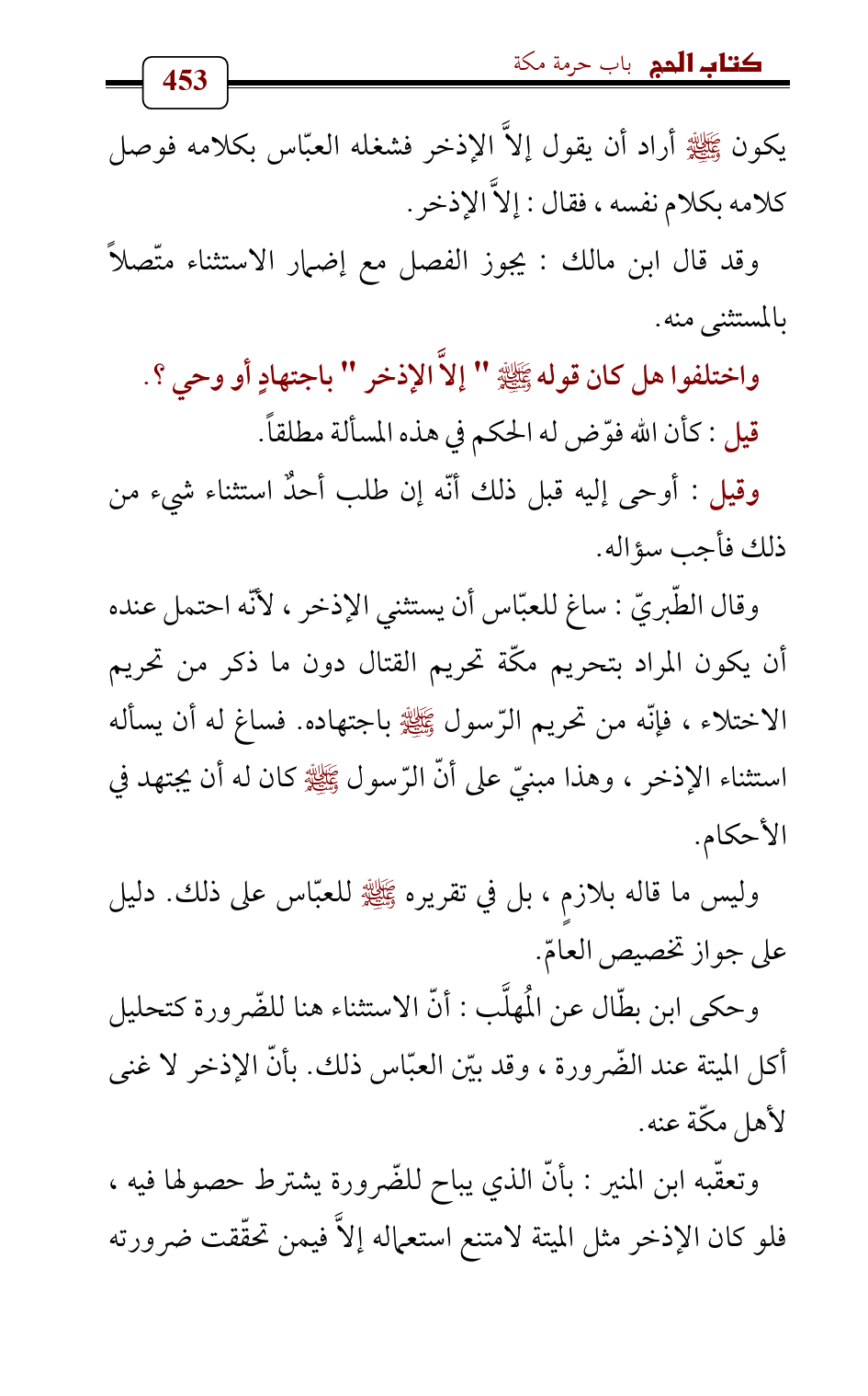 وحكى ابن بطّال عن المُهلَّب: أنّ الاستثناء هنا للضّرورة كتحليل أكل الميتة عند الضّرورة، وقد بيّن العبّاس ذلك. بأنّ الإذخر لا غنى لأهل مكّة عنه.