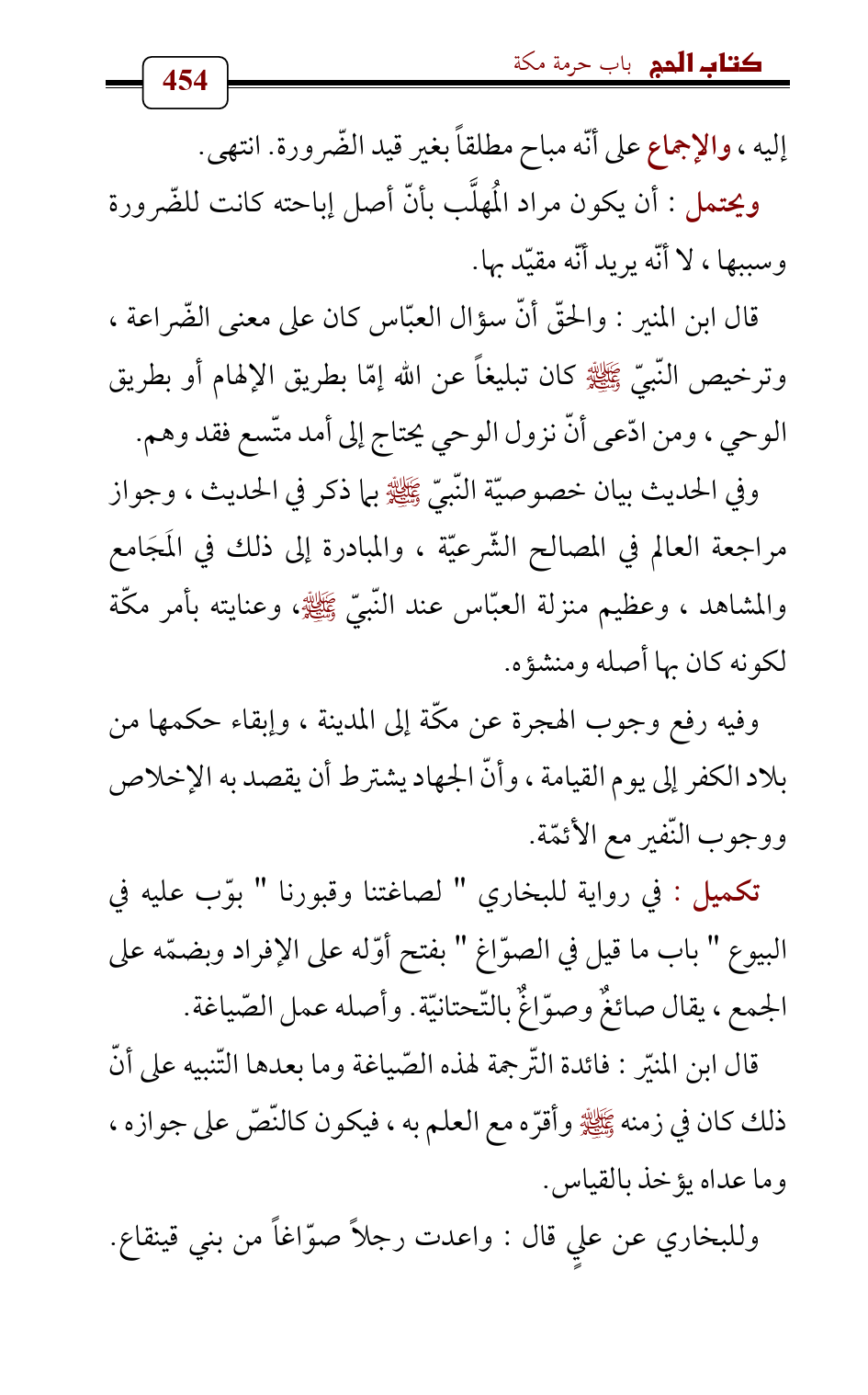 ويحتمل: أن يكون مراد المُهلَّب بأنّ أصل إباحته كانت للضّرورة وسببها، لا أنّه يريد أنّه مقيّد بها.