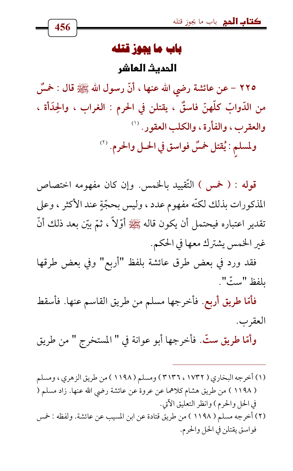 225 - عن عائشة رضي الله عنها , أنّ رسول الله - صلى الله عليه وسلم - قال: خمسٌ من الدّوابّ كلّهنّ فاسقٌ , يقتلن في الحرم: الغراب , والحِدَأة , والعقرب , والفأرة , والكلب العقور. (¬1)