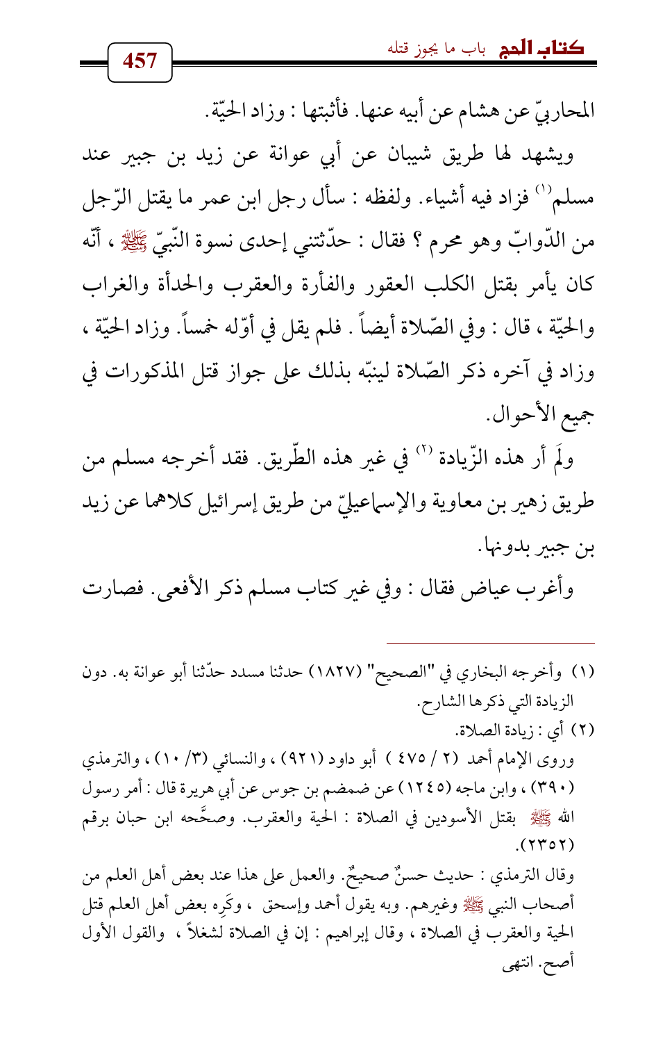 ويشهد لها طريق شيبان عن أبي عوانة عن زيد بن جبير عند مسلم (¬1) فزاد فيه أشياء. ولفظه: سأل رجل ابن عمر ما يقتل الرّجل من الدّوابّ وهو محرم؟ فقال: حدّثتني إحدى نسوة النّبيّ - صلى الله عليه وسلم - , أنّه كان يأمر بقتل الكلب العقور والفأرة والعقرب والحدأة والغراب والحيّة , قال: وفي الصّلاة أيضاً. فلم يقل في أوّله خمساً. وزاد الحيّة، وزاد في آخره ذكر الصّلاة لينبّه بذلك على جواز قتل المذكورات في جميع الأحوال.