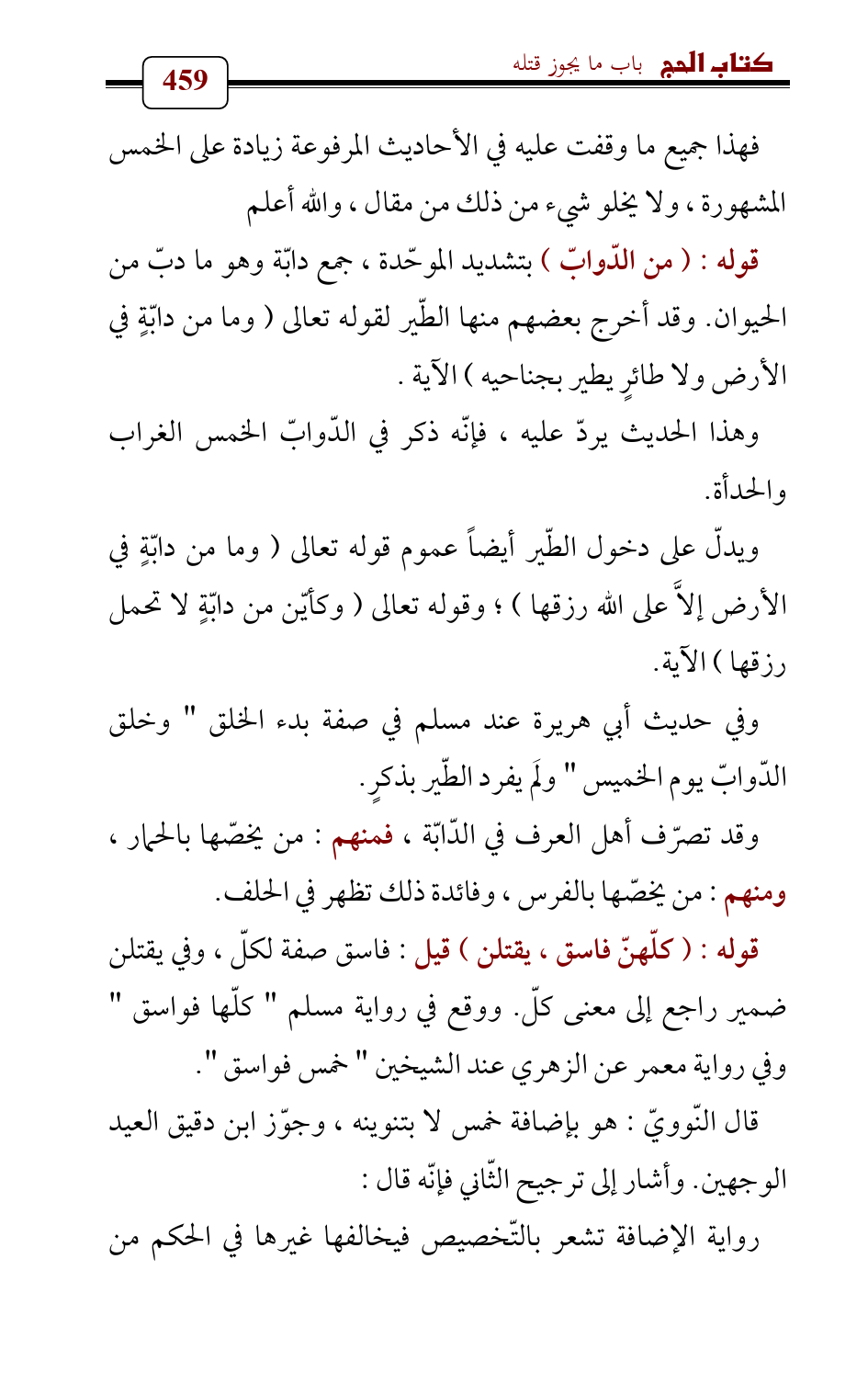 قوله: (من الدّوابّ) بتشديد الموحّدة، جمع دابّة وهو ما دبّ من الحيوان. وقد أخرج بعضهم منها الطّير لقوله تعالى (وما من دابّةٍ في الأرض ولا طائرٍ يطير بجناحيه) الآية.