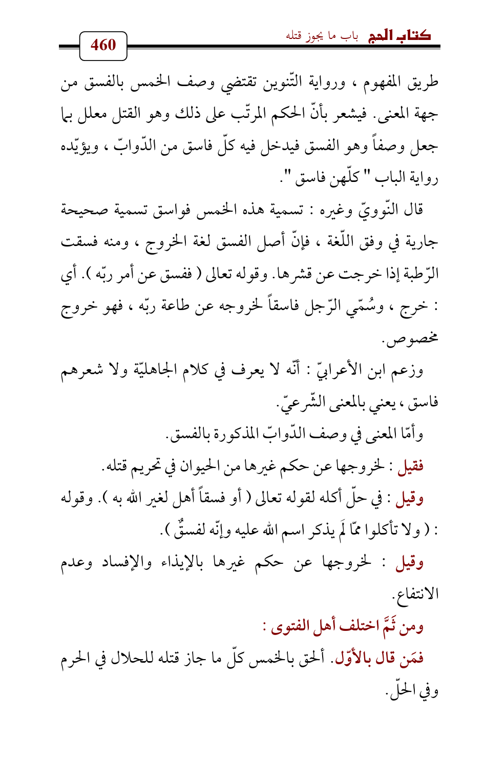 طريق المفهوم، ورواية التّنوين تقتضي وصف الخمس بالفسق من جهة المعنى. فيشعر بأنّ الحكم المرتّب على ذلك وهو القتل معلل بما جعل وصفاً وهو الفسق فيدخل فيه كلّ فاسق من الدّوابّ، ويؤيّده رواية الباب " كلّهن فاسق ".