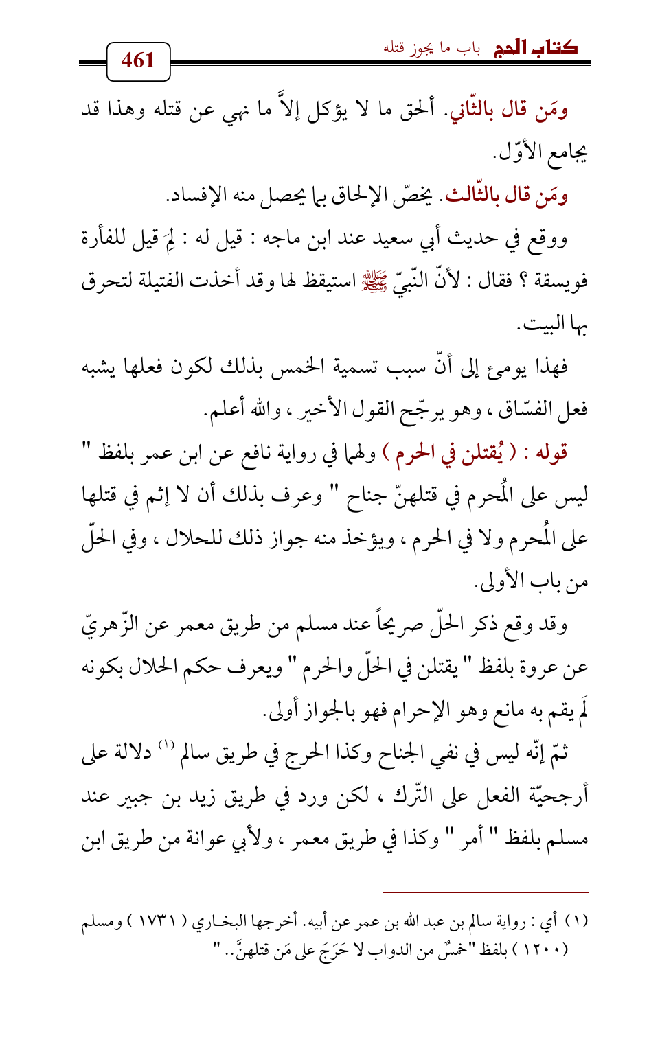 (¬1) أي: رواية سالم بن عبد الله بن عمر عن أبيه. أخرجها البخاري (1731) ومسلم (1200) بلفظ " خمسٌ من الدواب لا حَرَجَ على مَن قتلهنَّ .. "