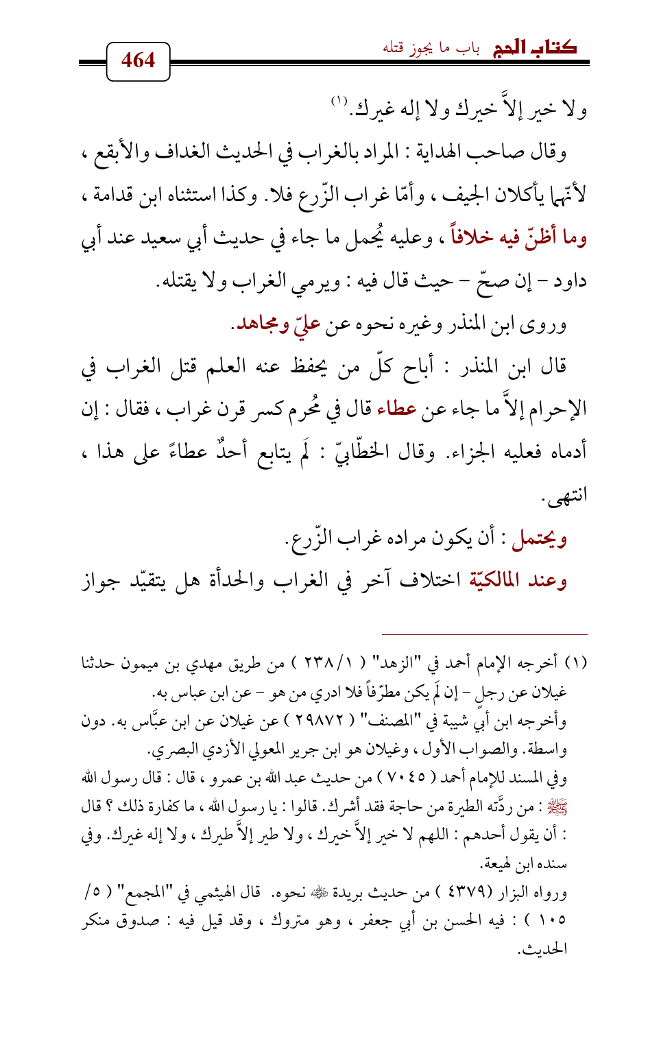 وقال صاحب الهداية: المراد بالغراب في الحديث الغداف والأبقع , لأنّهما يأكلان الجيف، وأمّا غراب الزّرع فلا. وكذا استثناه ابن قدامة، وما أظنّ فيه خلافاً، وعليه يُحمل ما جاء في حديث أبي سعيد عند أبي داود - إن صحّ - حيث قال فيه: ويرمي الغراب ولا يقتله.
