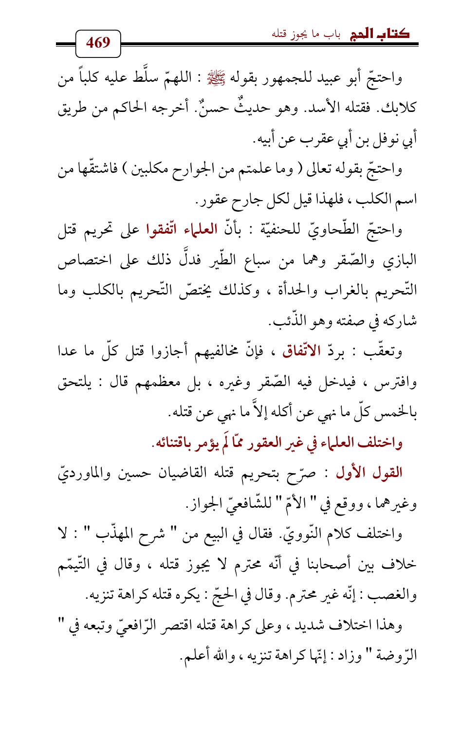 وتعقّب: بردّ الاتّفاق، فإنّ مخالفيهم أجازوا قتل كلّ ما عدا وافترس، فيدخل فيه الصّقر وغيره، بل معظمهم قال: يلتحق بالخمس كلّ ما نهي عن أكله إلاَّ ما نهي عن قتله.