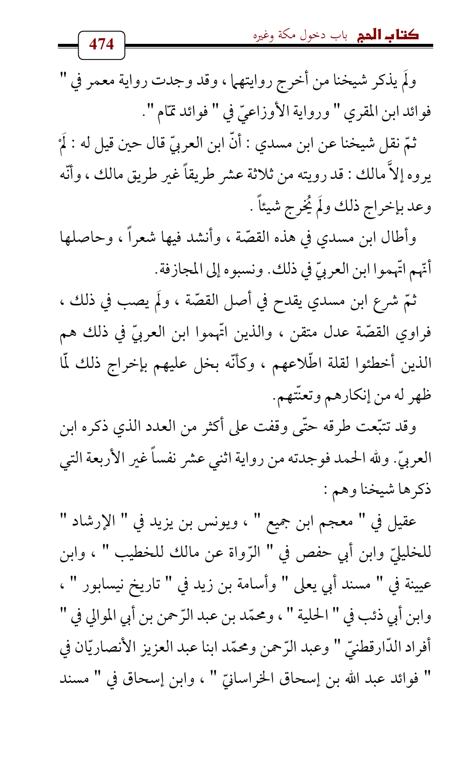 وقد تتبّعت طرقه حتّى وقفت على أكثر من العدد الذي ذكره ابن العربيّ. ولله الحمد فوجدته من رواية اثني عشر نفساً غير الأربعة التي ذكرها شيخنا وهم: