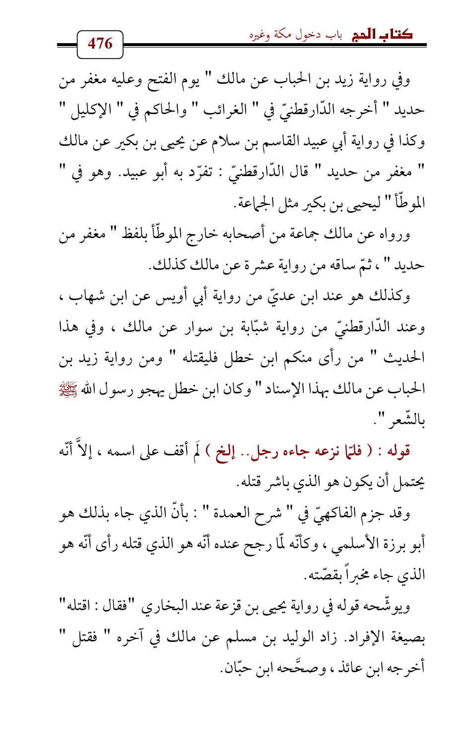 وكذلك هو عند ابن عديّ من رواية أبي أويس عن ابن شهاب، وعند الدّارقطنيّ من رواية شبّابة بن سوار عن مالك، وفي هذا الحديث " من رأى منكم ابن خطل فليقتله " ومن رواية زيد بن الحباب عن مالك بهذا الإسناد " وكان ابن خطل يهجو رسول الله - صلى الله عليه وسلم - بالشّعر ".