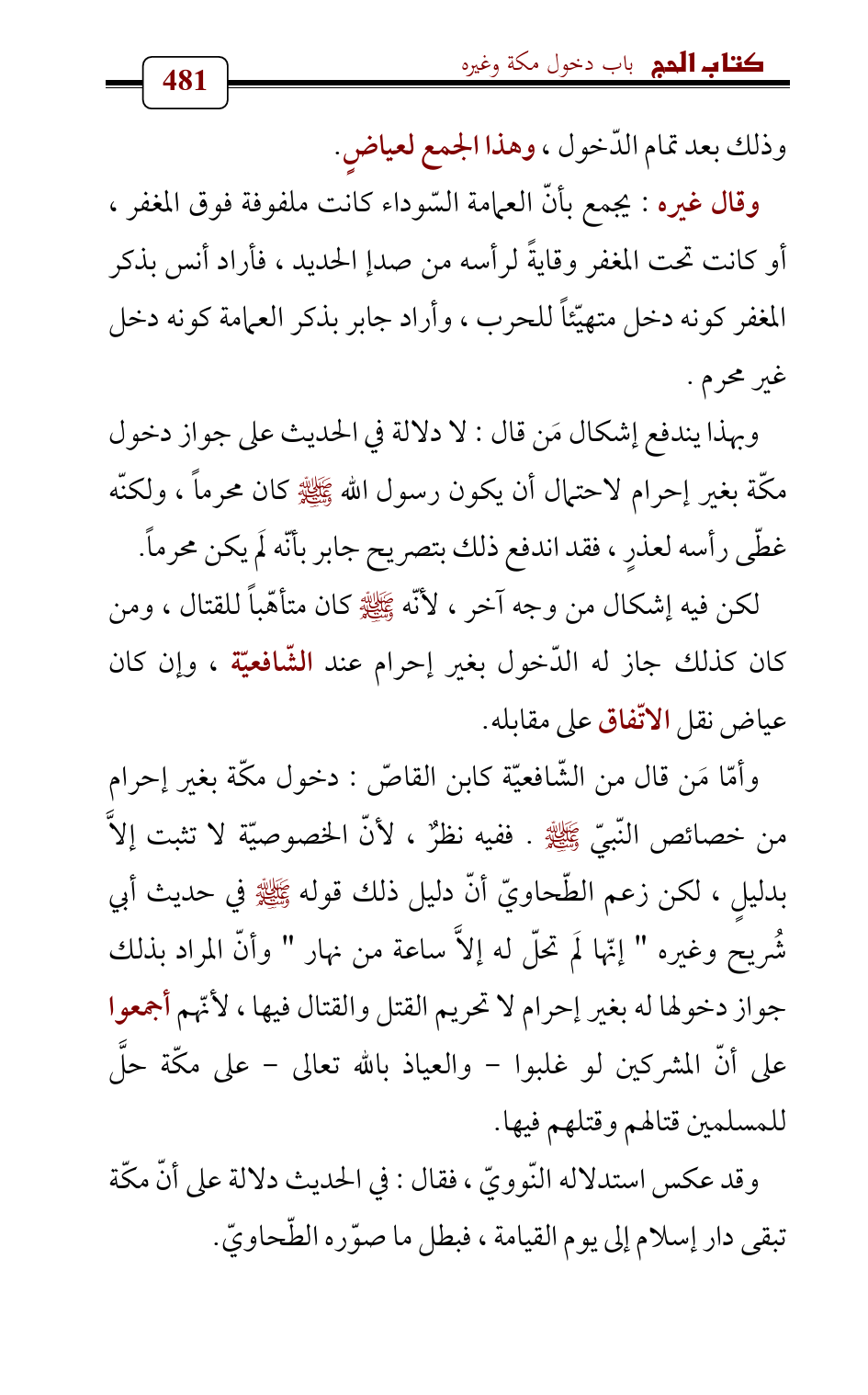 وبهذا يندفع إشكال مَن قال: لا دلالة في الحديث على جواز دخول مكّة بغير إحرام لاحتمال أن يكون رسول الله - صلى الله عليه وسلم - كان محرماً , ولكنّه غطّى رأسه لعذرٍ، فقد اندفع ذلك بتصريح جابر بأنّه لَم يكن محرماً.
