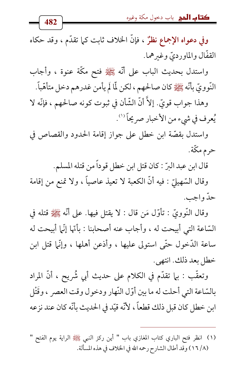 (¬1) انظر فتح الباري كتاب المغازي باب " أين ركز النبي - صلى الله عليه وسلم - الراية يوم الفتح " (8/ 16) وقد أطال الشارح رحمه الله في الخلاف في هذه المسألة.