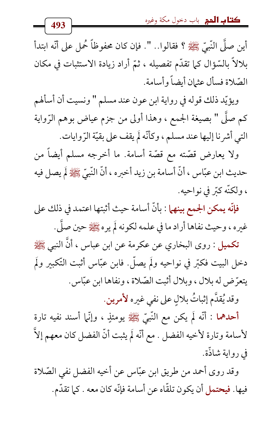 ولا يعارض قصّته مع قصّة أسامة. ما أخرجه مسلم أيضاً من حديث ابن عبّاس , أنّ أسامة بن زيد أخبره , أنّ النّبيّ - صلى الله عليه وسلم - لَم يصل فيه، ولكنّه كبّر في نواحيه.