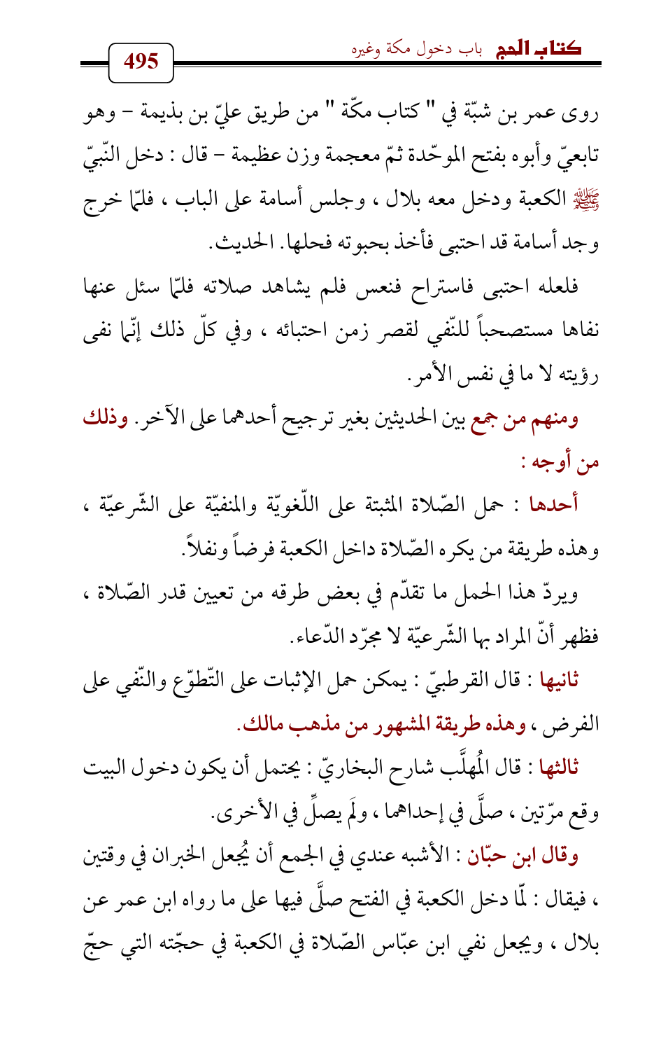وقال ابن حبّان: الأشبه عندي في الجمع أن يُجعل الخبران في وقتين , فيقال: لَمّا دخل الكعبة في الفتح صلَّى فيها على ما رواه ابن عمر عن بلال، ويجعل نفي ابن عبّاس الصّلاة في الكعبة في حجّته التي حجّ
