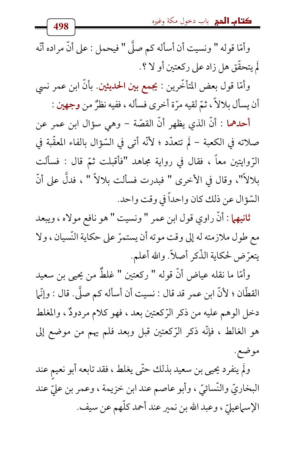 وأمّا قول بعض المتأخّرين: يجمع بين الحديثين. بأنّ ابن عمر نسي أن يسأل بلالاً , ثمّ لقيه مرّة أخرى فسأله، ففيه نظرٌ من وجهين: