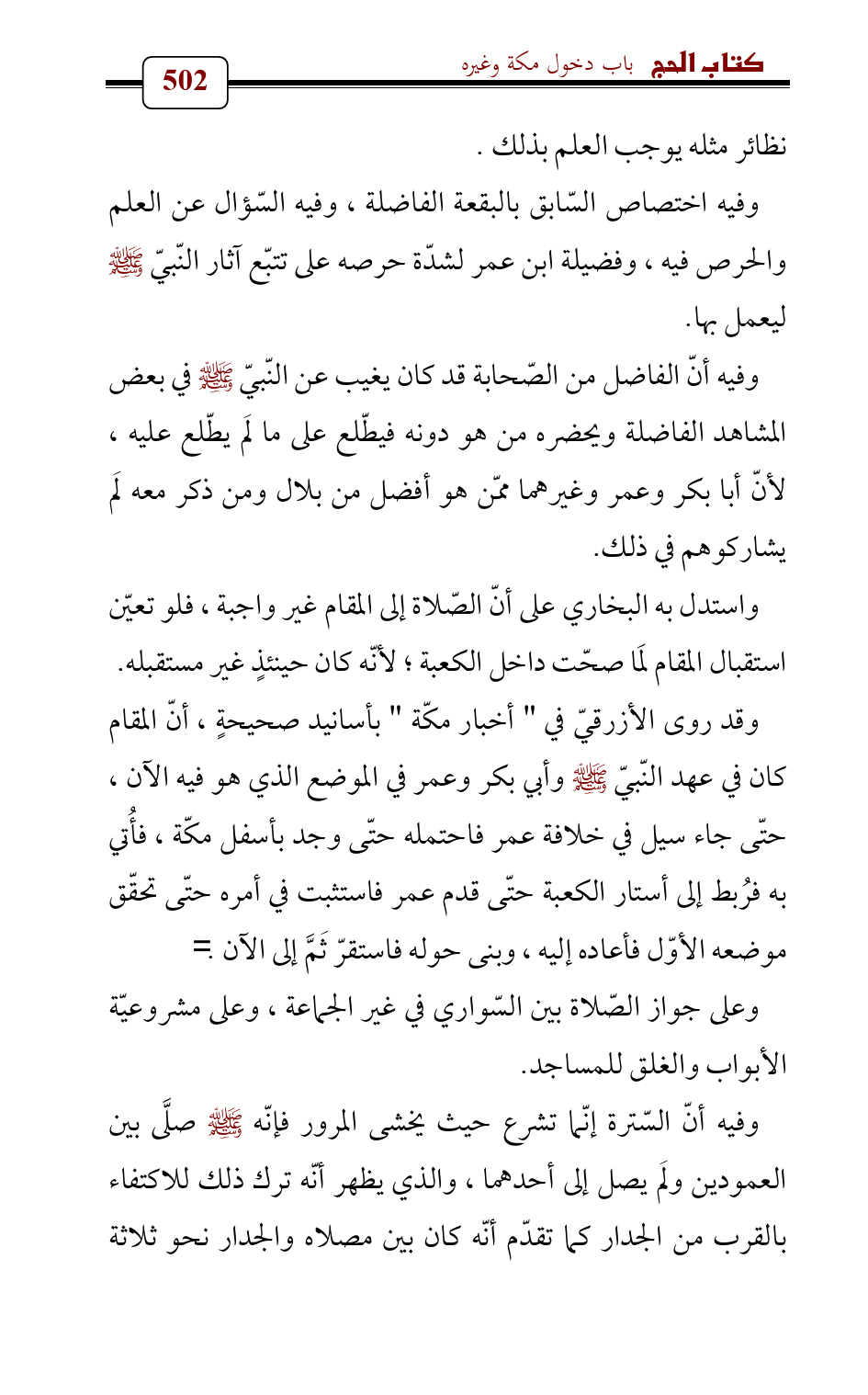 وفيه اختصاص السّابق بالبقعة الفاضلة، وفيه السّؤال عن العلم والحرص فيه، وفضيلة ابن عمر لشدّة حرصه على تتبّع آثار النّبيّ - صلى الله عليه وسلم - ليعمل بها.