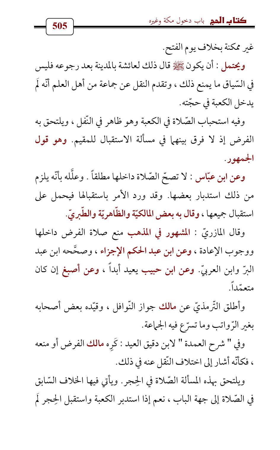 وقال المازريّ: المشهور في المذهب منع صلاة الفرض داخلها ووجوب الإعادة، وعن ابن عبد الحكم الإجزاء، وصحَّحه ابن عبد البرّ وابن العربيّ. وعن ابن حبيب يعيد أبداً، وعن أصبغ إن كان متعمّداً.