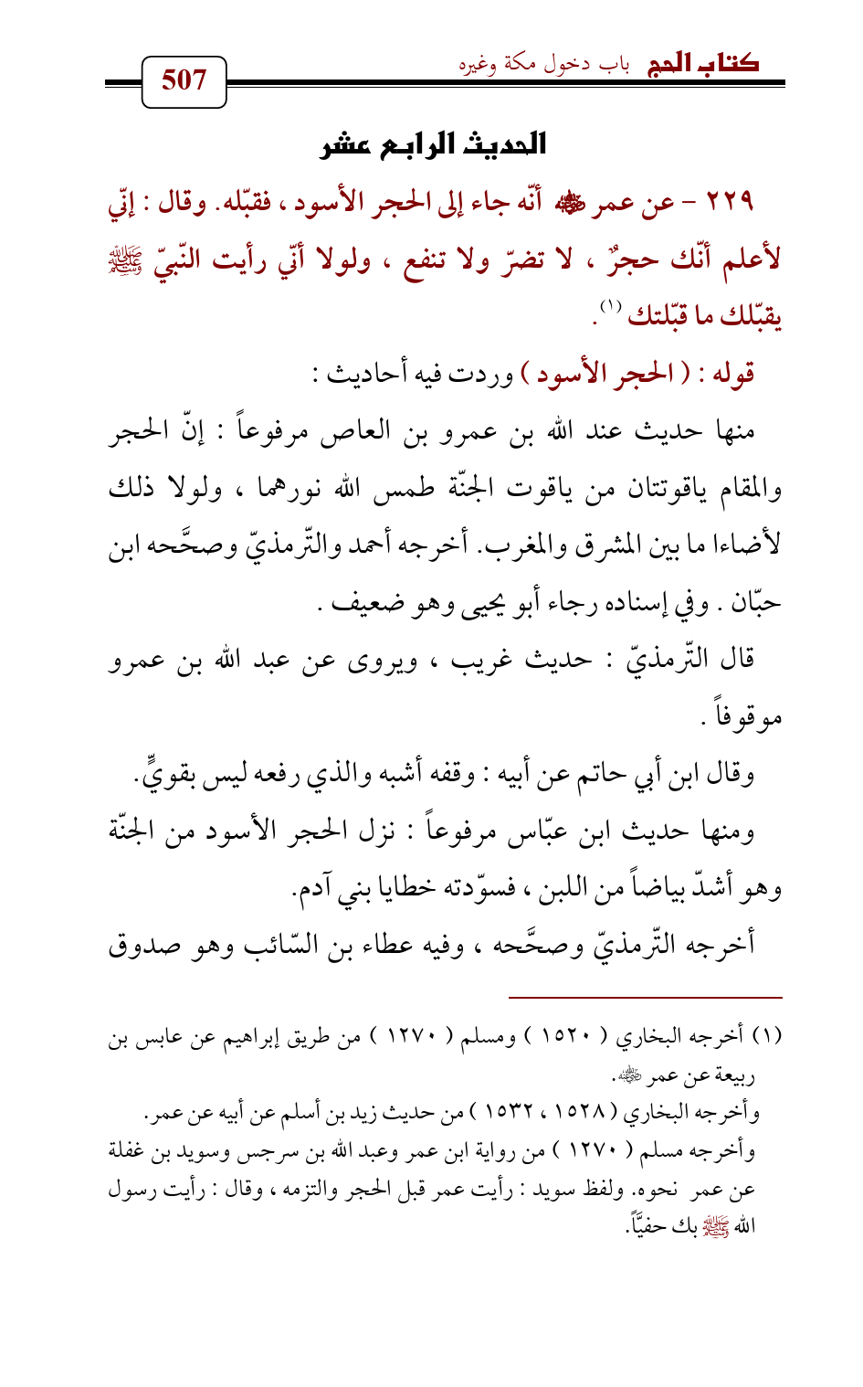 229 - عن عمر - رضي الله عنه - أنّه جاء إلى الحجر الأسود , فقبّله. وقال: إنّي لأعلم أنّك حجرٌ , لا تضرّ ولا تنفع , ولولا أنّي رأيت النّبيّ - صلى الله عليه وسلم - يقبّلك ما قبّلتك (¬1).