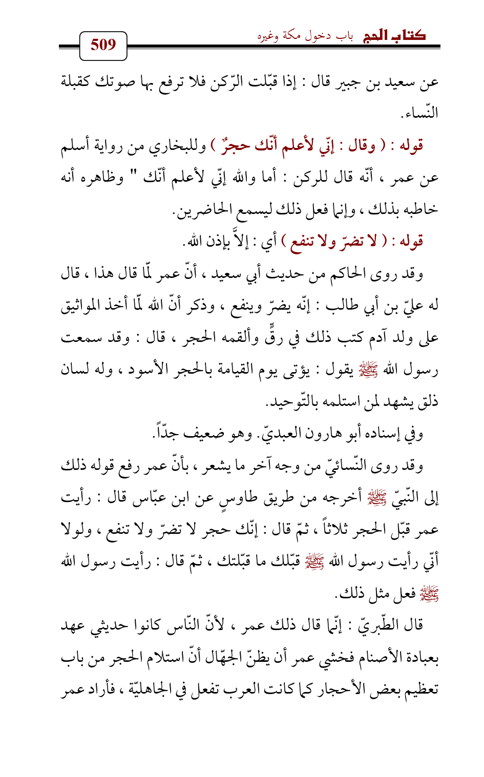 وقد روى النّسائيّ من وجه آخر ما يشعر , بأنّ عمر رفع قوله ذلك إلى النّبيّ - صلى الله عليه وسلم - أخرجه من طريق طاوسٍ عن ابن عبّاس قال: رأيت عمر قبّل الحجر ثلاثاً , ثمّ قال: إنّك حجر لا تضرّ ولا تنفع، ولولا أنّي رأيت رسول الله - صلى الله عليه وسلم - قبّلك ما قبّلتك , ثمّ قال: رأيت رسول الله - صلى الله عليه وسلم - فعل مثل ذلك.