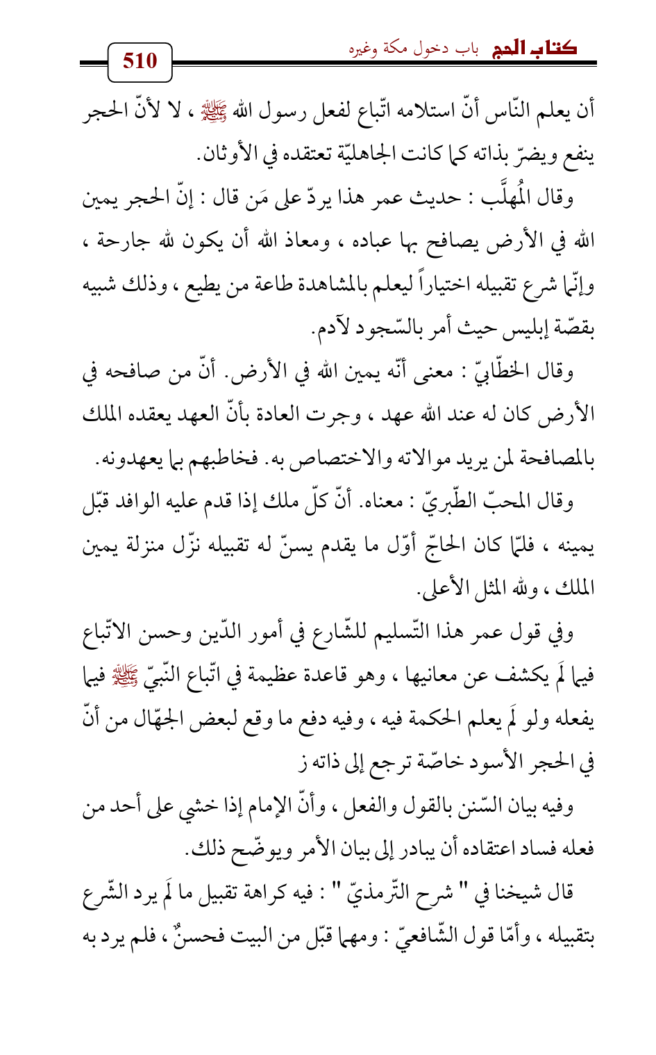 وفي قول عمر هذا التّسليم للشّارع في أمور الدّين وحسن الاتّباع فيما لَم يكشف عن معانيها، وهو قاعدة عظيمة في اتّباع النّبيّ - صلى الله عليه وسلم - فيما يفعله ولو لَم يعلم الحكمة فيه، وفيه دفع ما وقع لبعض الجهّال من أنّ في الحجر الأسود خاصّة ترجع إلى ذاته ز
