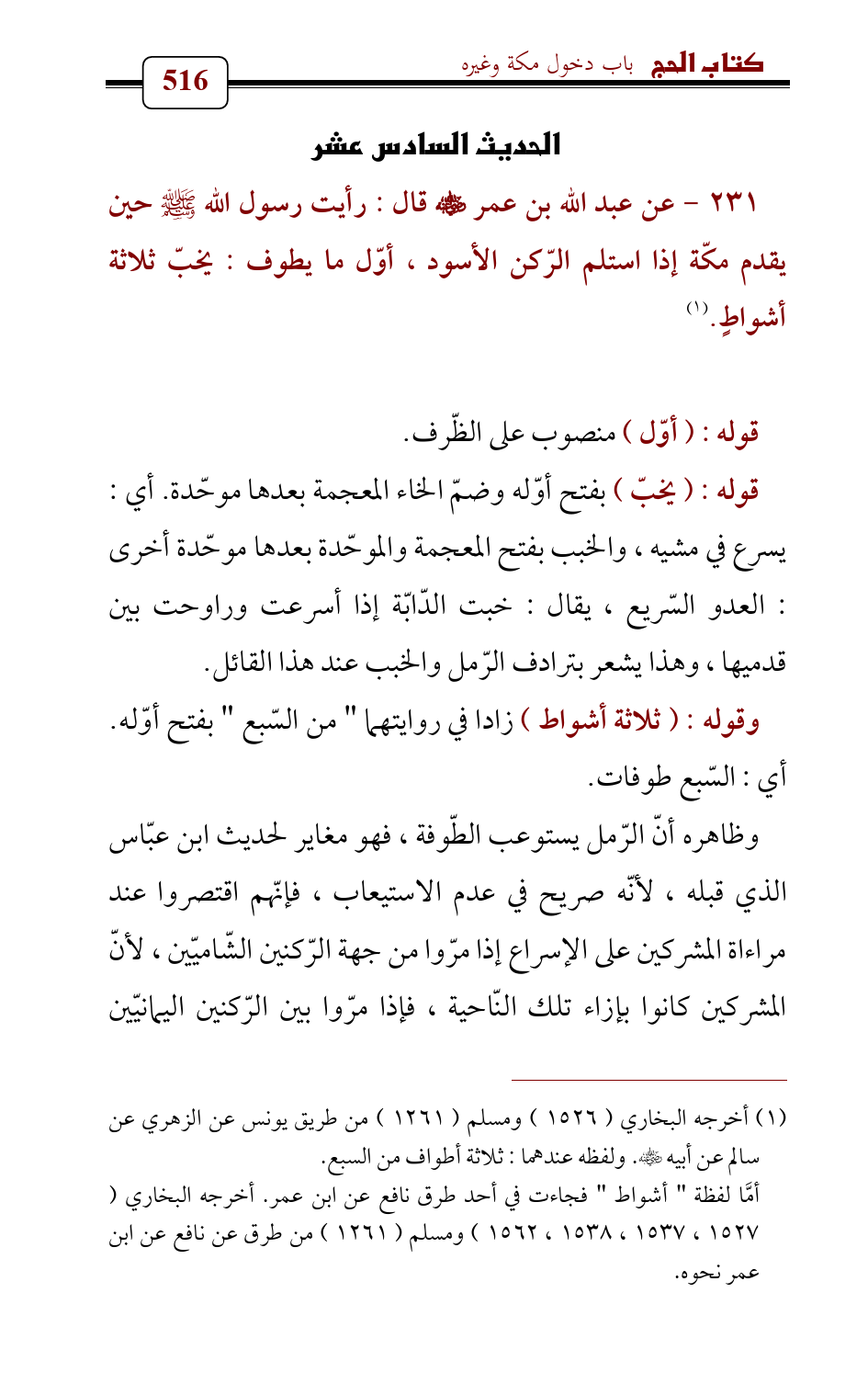 231 - عن عبد الله بن عمر - رضي الله عنه - قال: رأيت رسول الله - صلى الله عليه وسلم - حين يقدم مكّة إذا استلم الرّكن الأسود , أوّل ما يطوف: يخبّ ثلاثة أشواطٍ. (¬1)