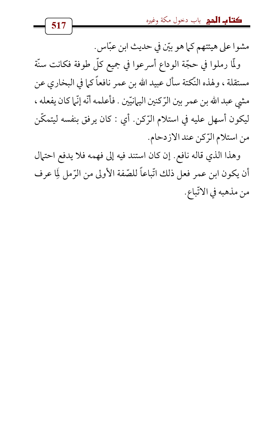 ولَمّا رملوا في حجّة الوداع أسرعوا في جميع كلّ طوفة فكانت سنّة مستقلة، ولهذه النّكتة سأل عبيد الله بن عمر نافعاً كما في البخاري عن مشي عبد الله بن عمر بين الرّكنين اليمانيّين. فأعلمه أنّه إنّما كان يفعله , ليكون أسهل عليه في استلام الرّكن. أي: كان يرفق بنفسه ليتمكّن من استلام الرّكن عند الازدحام.