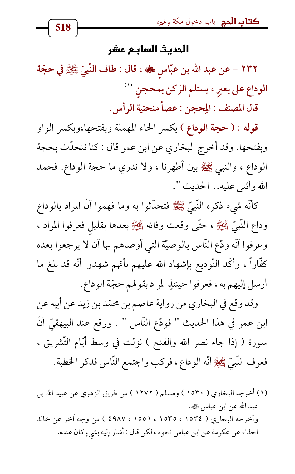 232 - عن عبد الله بن عبّاسٍ - رضي الله عنه - , قال: طاف النّبيّ - صلى الله عليه وسلم - في حجّة الوداع على بعيرٍ , يستلم الرّكن بمحجنٍ. (¬1)