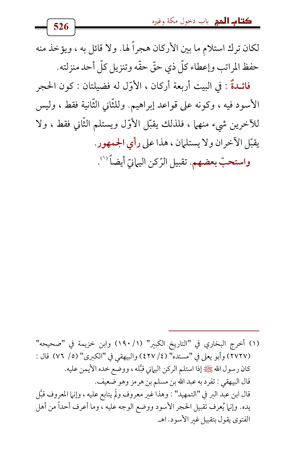 فائدةٌ: في البيت أربعة أركان، الأوّل له فضيلتان: كون الحجر الأسود فيه، وكونه على قواعد إبراهيم. وللثّاني الثّانية فقط، وليس للآخرين شيء منهما، فلذلك يقبّل الأوّل ويستلم الثّاني فقط , ولا يقبّل الآخران ولا يستلمان، هذا على رأي الجمهور.