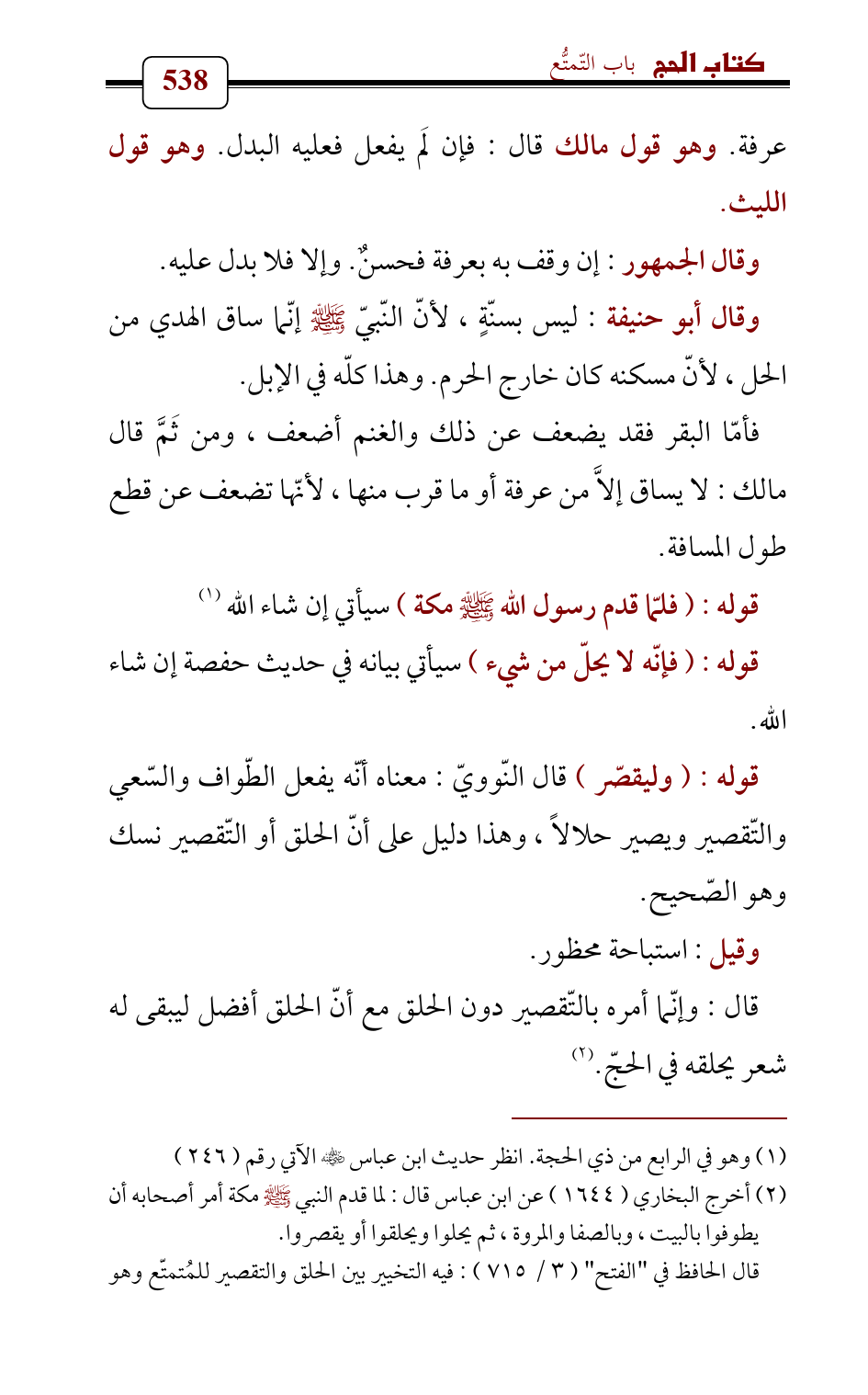 (¬2) أخرج البخاري (1644) عن ابن عباس قال: لما قدم النبي - صلى الله عليه وسلم - مكة أمر أصحابه أن يطوفوا بالبيت، وبالصفا والمروة، ثم يحلوا ويحلقوا أو يقصروا.