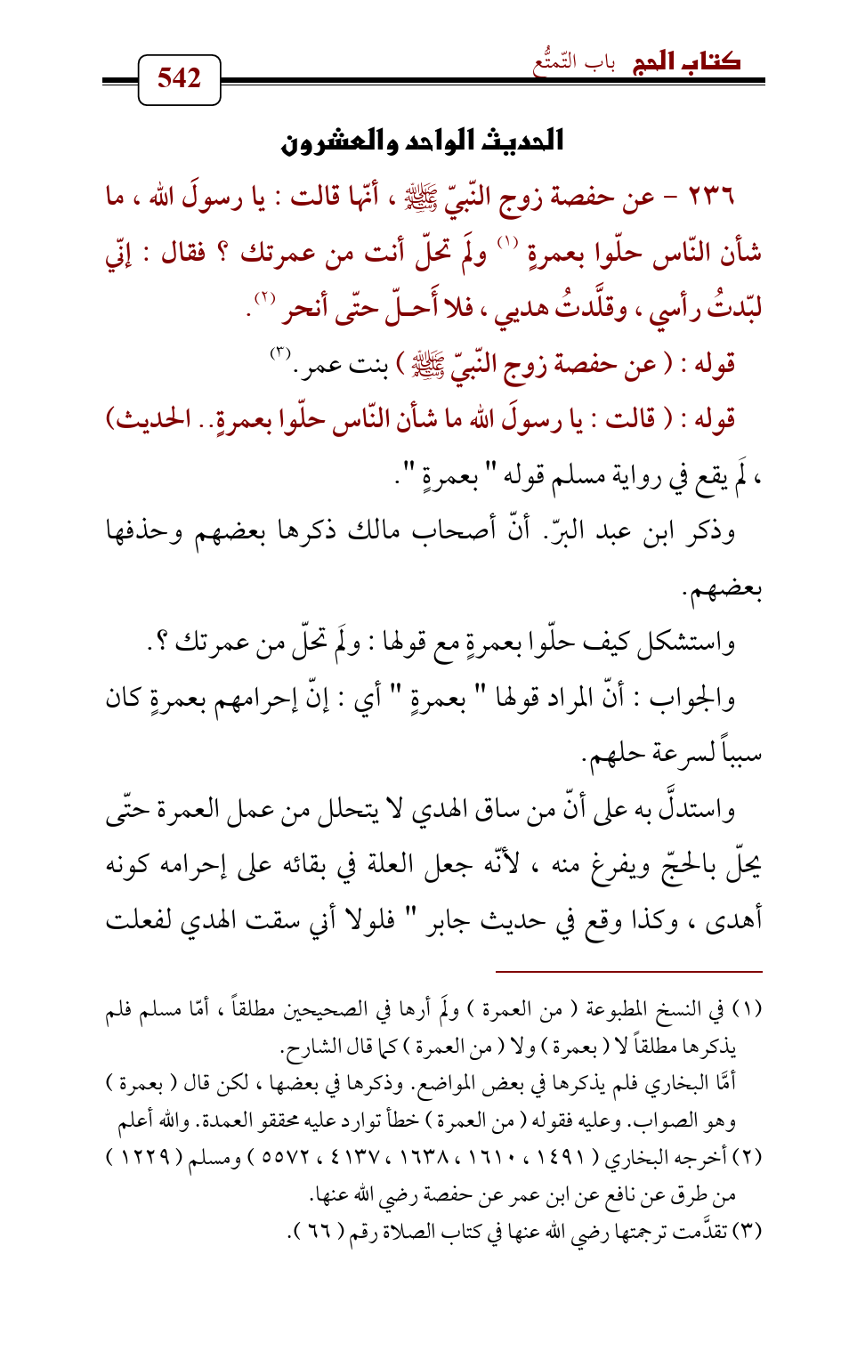 236 - عن حفصة زوج النّبيّ - صلى الله عليه وسلم - , أنّها قالت: يا رسولَ الله , ما شأن النّاس حلّوا بعمرةٍ (¬1) ولَم تحلّ أنت من عمرتك؟ فقال: إنّي لبّدتُ رأسي , وقلَّدتُ هديي , فلا أَحلّ حتّى أنحر (¬2).