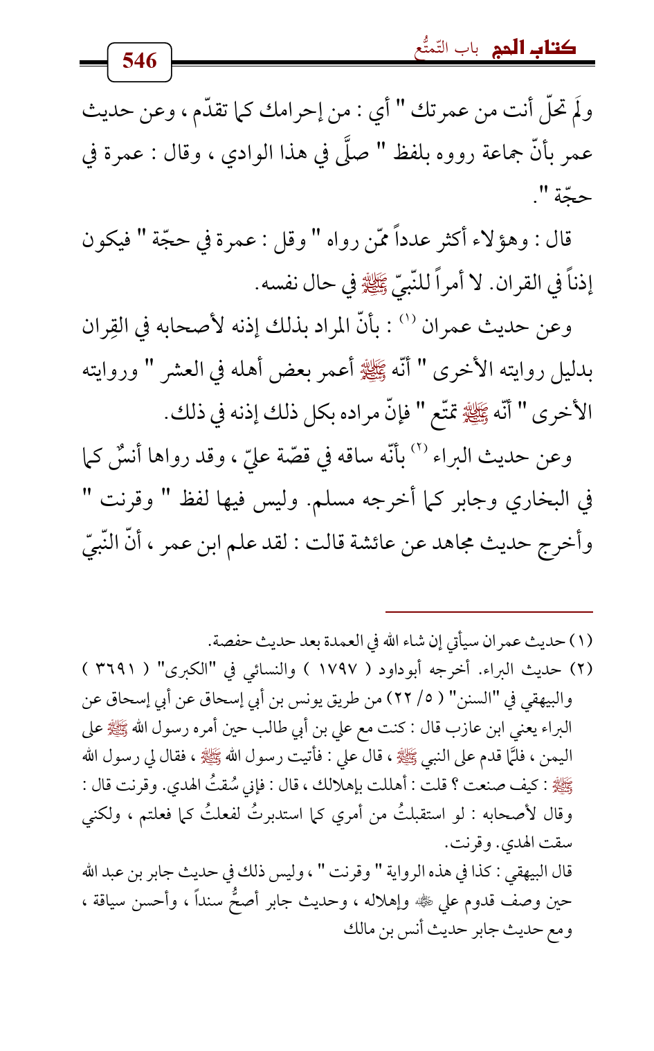 (¬2) حديث البراء. أخرجه أبوداود (1797) والنسائي في " الكبرى " (3691) والبيهقي في " السنن " (5/ 22) من طريق يونس بن أبي إسحاق عن أبي إسحاق عن البراء يعني ابن عازب قال: كنت مع علي بن أبي طالب حين أمره رسول الله - صلى الله عليه وسلم - على اليمن، فلمَّا قدم على النبي - صلى الله عليه وسلم -، قال علي: فأتيت رسول الله - صلى الله عليه وسلم -، فقال لي رسول الله - صلى الله عليه وسلم -: كيف صنعت؟ قلت: أهللت بإهلالك , قال: فإني سُقتُ الهدي. وقرنت قال: وقال لأصحابه: لو استقبلتُ من أمري كما استدبرتُ لفعلتُ كما فعلتم، ولكني سقت الهدي. وقرنت.