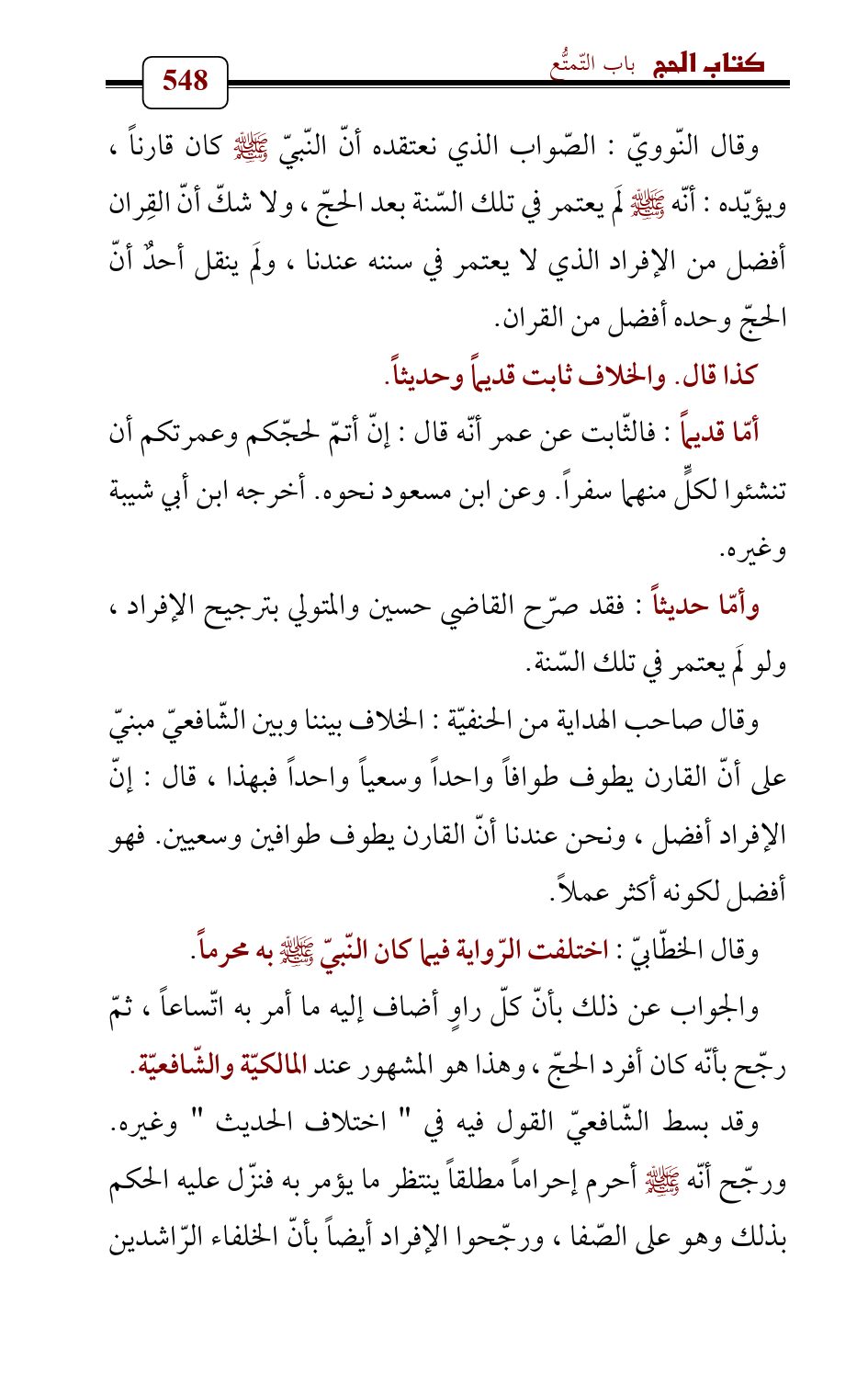 وقال النّوويّ: الصّواب الذي نعتقده أنّ النّبيّ - صلى الله عليه وسلم - كان قارناً، ويؤيّده: أنّه - صلى الله عليه وسلم - لَم يعتمر في تلك السّنة بعد الحجّ، ولا شكّ أنّ القِران أفضل من الإفراد الذي لا يعتمر في سننه عندنا، ولَم ينقل أحدٌ أنّ الحجّ وحده أفضل من القران.