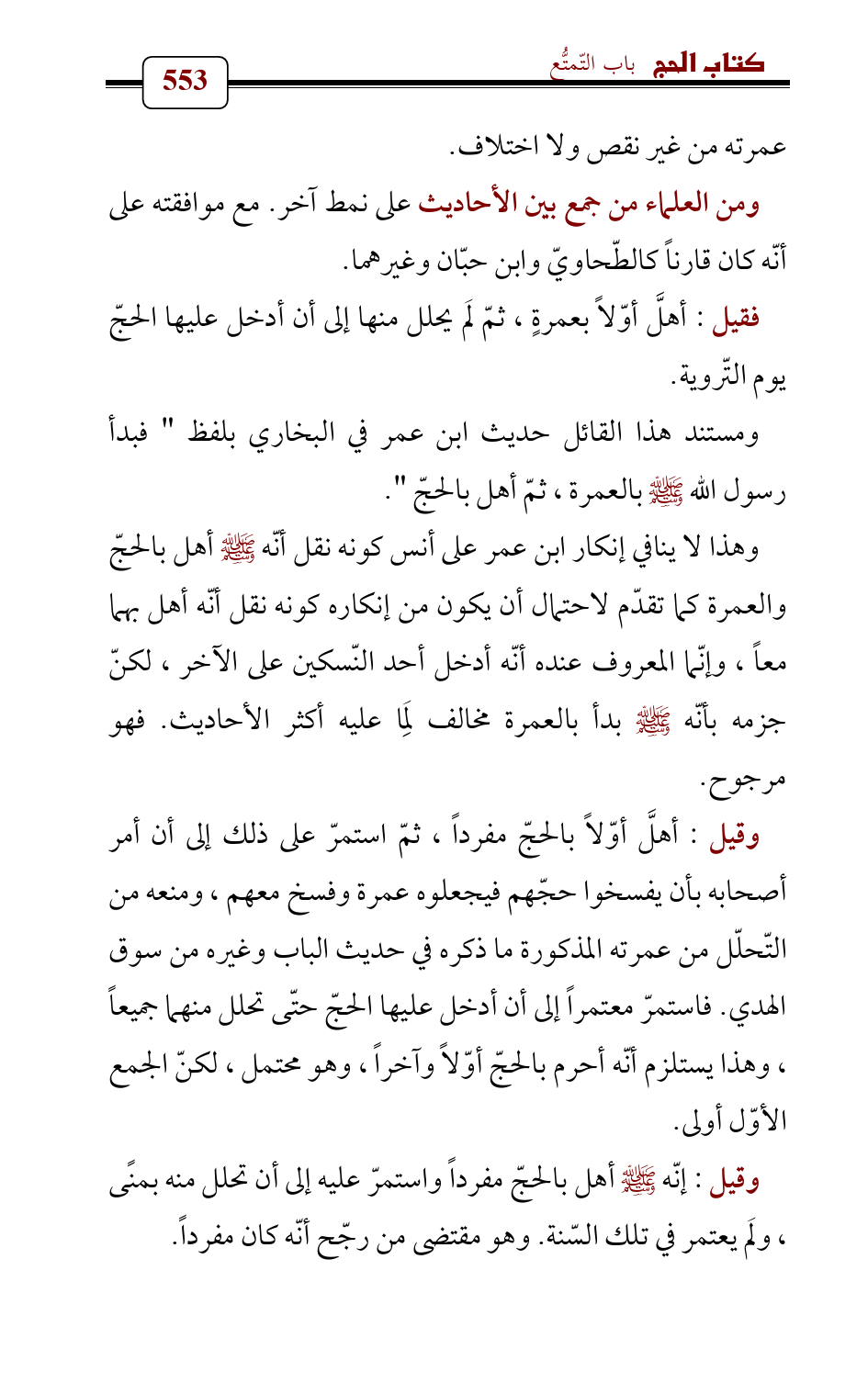 وقيل: إنّه - صلى الله عليه وسلم - أهل بالحجّ مفرداً واستمرّ عليه إلى أن تحلل منه بمنًى , ولَم يعتمر في تلك السّنة. وهو مقتضى من رجّح أنّه كان مفرداً.
