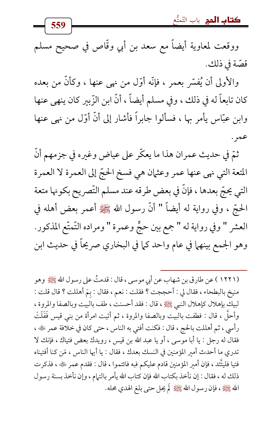ثمّ في حديث عمران هذا ما يعكّر على عياض وغيره في جزمهم أنّ المتعة التي نهى عنها عمر وعثمان هي فسخ الحجّ إلى العمرة لا العمرة التي يحجّ بعدها، فإنّ في بعض طرقه عند مسلم التّصريح بكونها متعة الحجّ، وفي رواية له أيضاً " أنّ رسول الله - صلى الله عليه وسلم - أعمر بعض أهله في العشر " وفي رواية له " جمع بين حجٍّ وعمرة " ومراده التّمتّع المذكور. وهو الجمع بينهما في عام واحد كما في البخاري صريحاً في حديث ابن