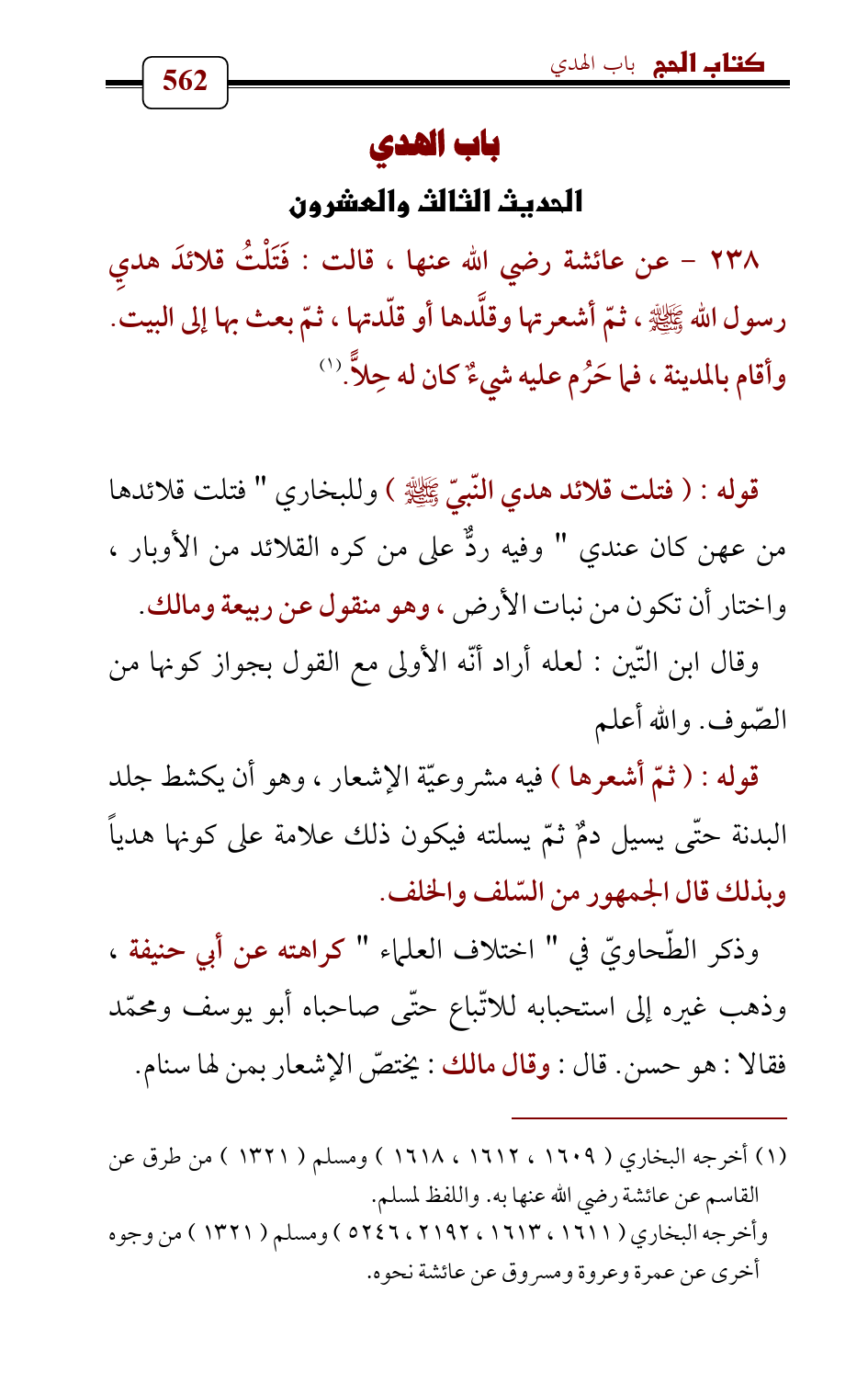 238 - عن عائشة رضي الله عنها , قالت: فَتَلْتُ قلائدَ هديِ رسول الله - صلى الله عليه وسلم - , ثمّ أشعرتها وقلَّدها أو قلّدتها , ثمّ بعث بها إلى البيت. وأقام بالمدينة , فما حَرُم عليه شيءٌ كان له حِلاًّ. (¬1)