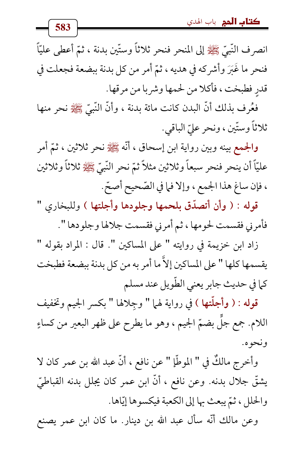 فعُرف بذلك أنّ البدن كانت مائة بدنة , وأنّ النّبيّ - صلى الله عليه وسلم - نحر منها ثلاثاً وستّين , ونحر عليّ الباقي.