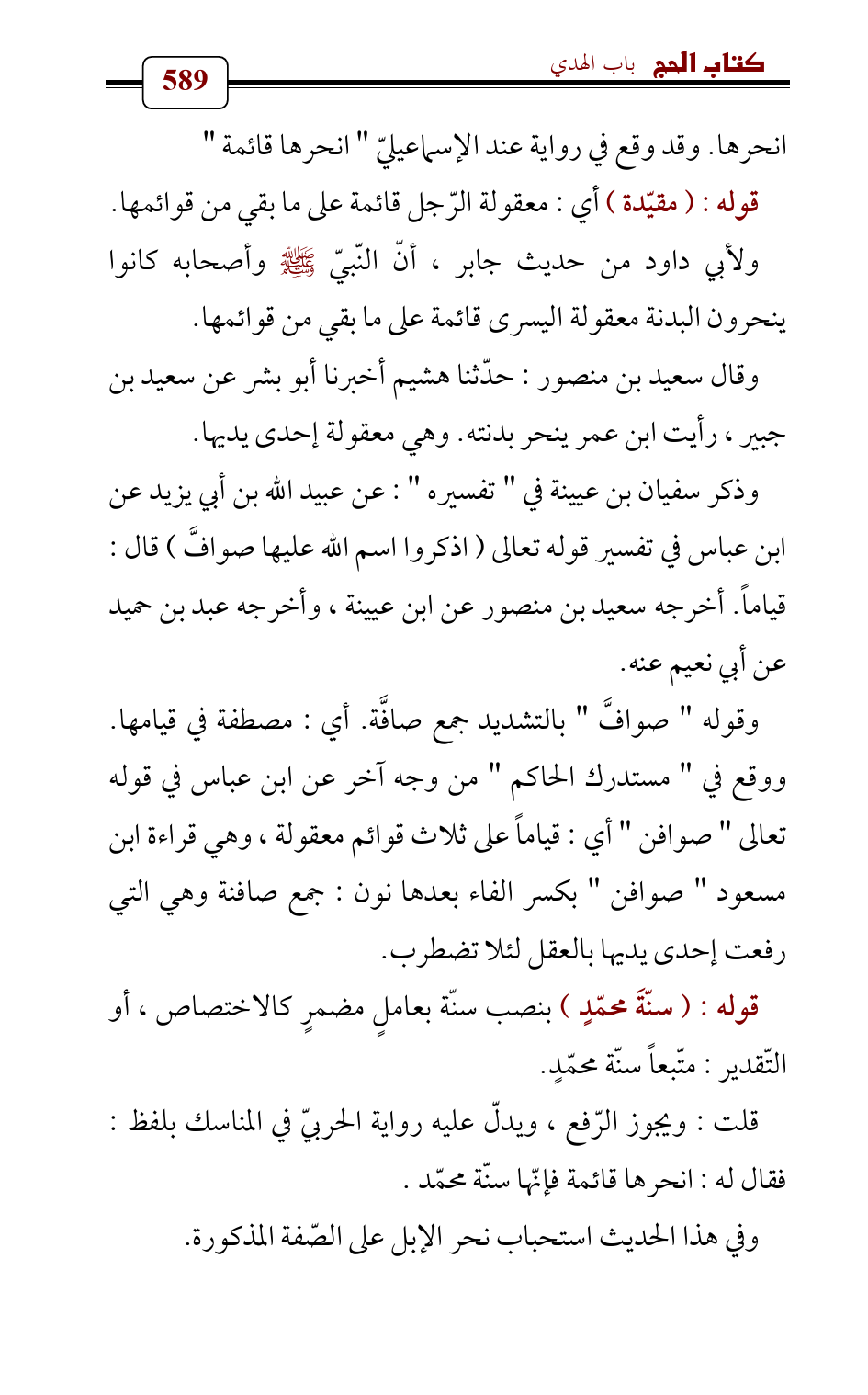 وذكر سفيان بن عيينة في " تفسيره ": عن عبيد الله بن أبي يزيد عن ابن عباس في تفسير قوله تعالى (اذكروا اسم الله عليها صوافَّ) قال: قياماً. أخرجه سعيد بن منصور عن ابن عيينة , وأخرجه عبد بن حميد عن أبي نعيم عنه.
