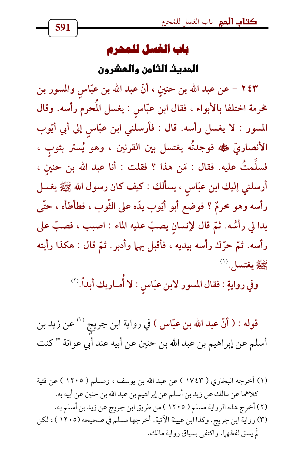 243 - عن عبد الله بن حنينٍ , أنّ عبد الله بن عبّاسٍ والمسور بن مخرمة اختلفا بالأبواء , فقال ابن عبّاسٍ: يغسل المُحرم رأسه. وقال المسور: لا يغسل رأسه. قال: فأرسلني ابن عبّاسٍ إلى أبي أيّوب الأنصاريّ - رضي الله عنه - فوجدتُه يغتسل بين القرنين , وهو يُستر بثوبٍ , فسلَّمتُ عليه. فقال: مَن هذا؟ فقلت: أنا عبد الله بن حنينٍ , أرسلني إليك ابن عبّاسٍ , يسألك: كيف كان رسول الله - صلى الله عليه وسلم - يغسل رأسه وهو محرمٌ؟ فوضع أبو أيّوب يدَه على الثّوب , فطأطأه , حتّى بدا لي رأسُه. ثمّ قال لإنسانٍ يصبّ عليه الماء: اصبب , فصبّ على رأسه. ثمّ حرّك رأسه بيديه , فأقبل بهما وأدبر. ثمّ قال: هكذا رأيته - صلى الله عليه وسلم - يغتسل. (¬1)