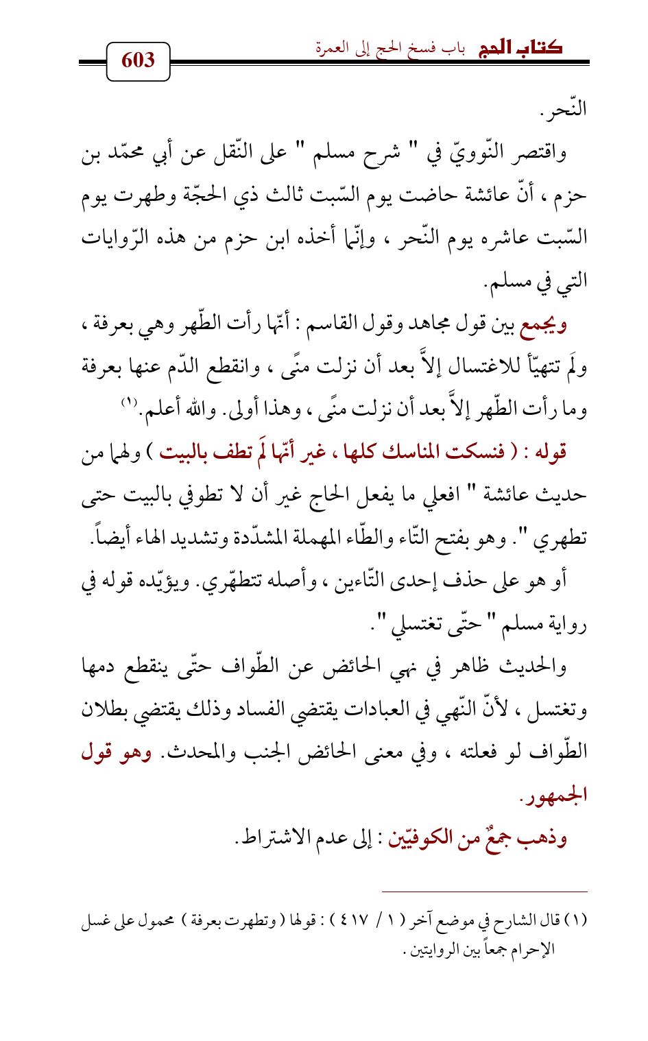 واقتصر النّوويّ في " شرح مسلم " على النّقل عن أبي محمّد بن حزم , أنّ عائشة حاضت يوم السّبت ثالث ذي الحجّة وطهرت يوم السّبت عاشره يوم النّحر، وإنّما أخذه ابن حزم من هذه الرّوايات التي في مسلم.