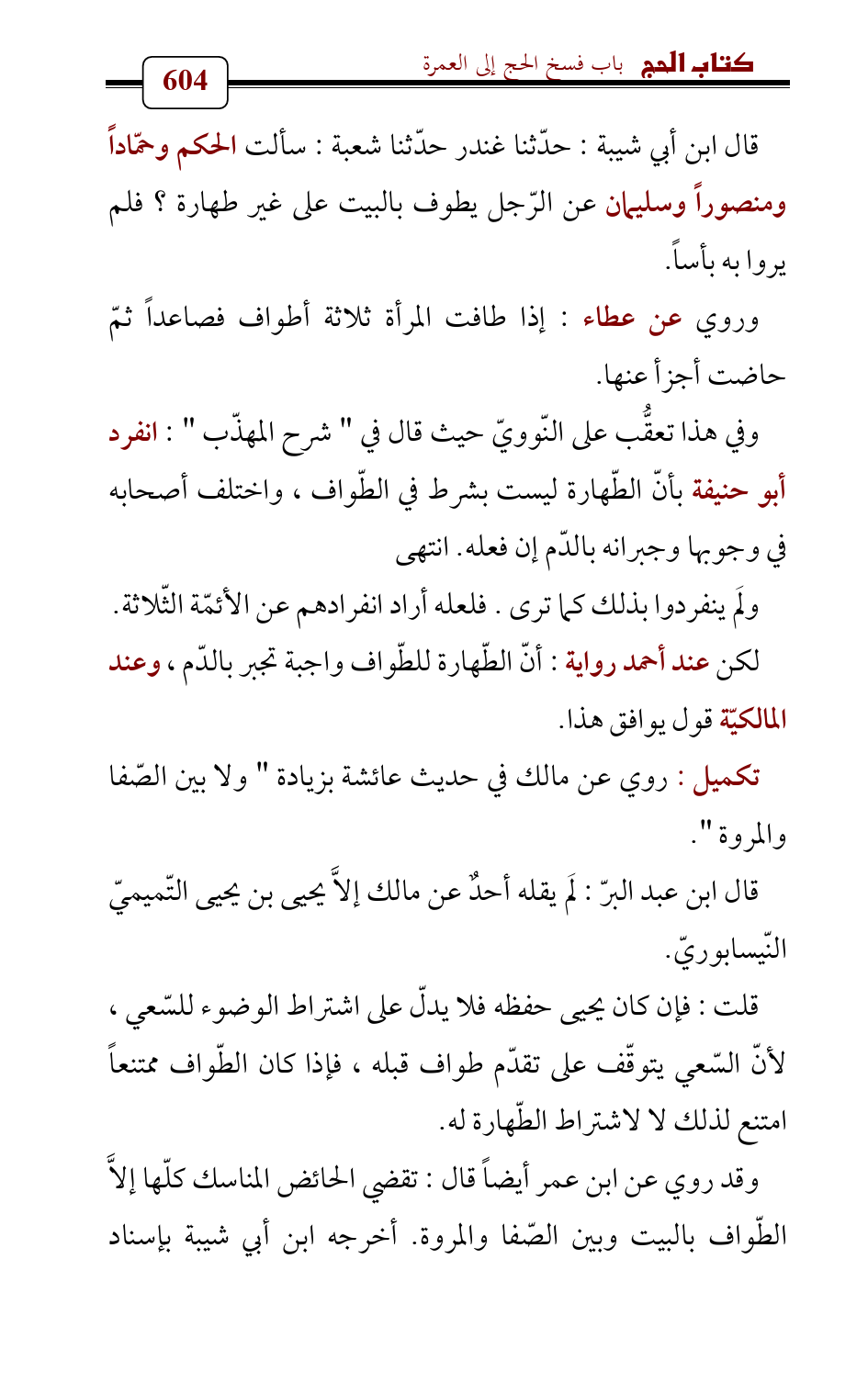 تكميل: روي عن مالك في حديث عائشة بزيادة " ولا بين الصّفا والمروة ".