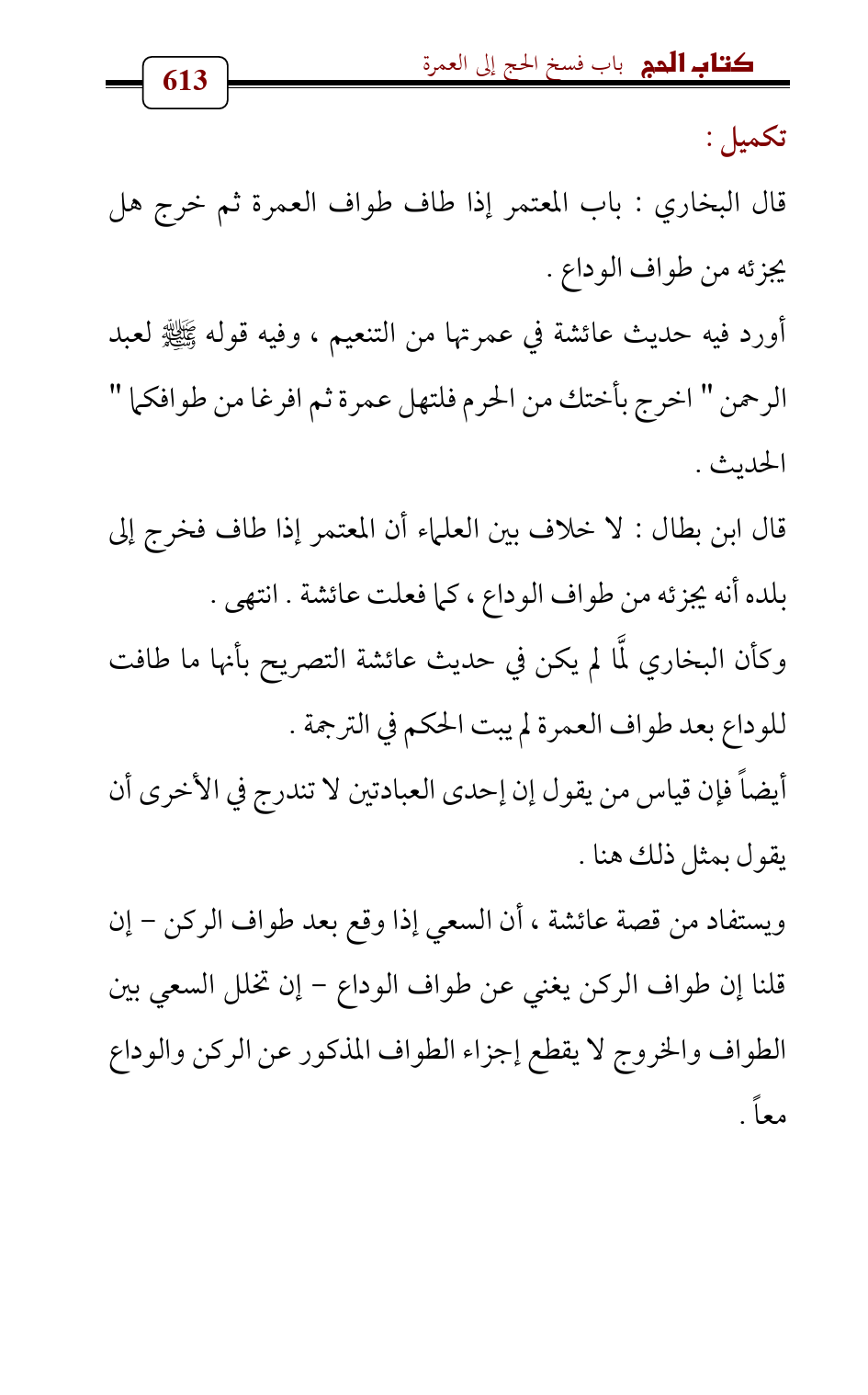 وكأن البخاري لمَّا لم يكن في حديث عائشة التصريح بأنها ما طافت للوداع بعد طواف العمرة لم يبت الحكم في الترجمة.