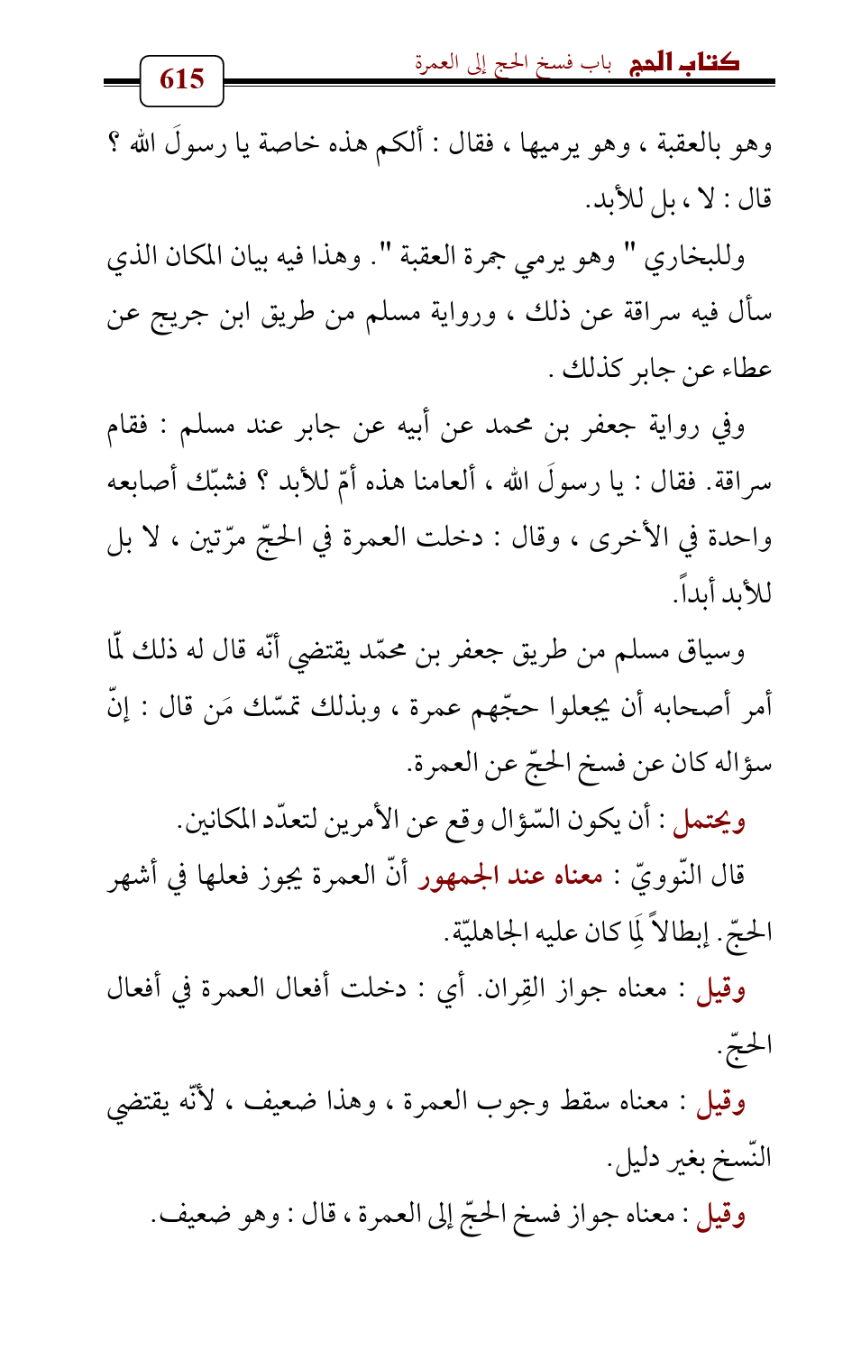 وقيل: معناه سقط وجوب العمرة، وهذا ضعيف , لأنّه يقتضي النّسخ بغير دليل.